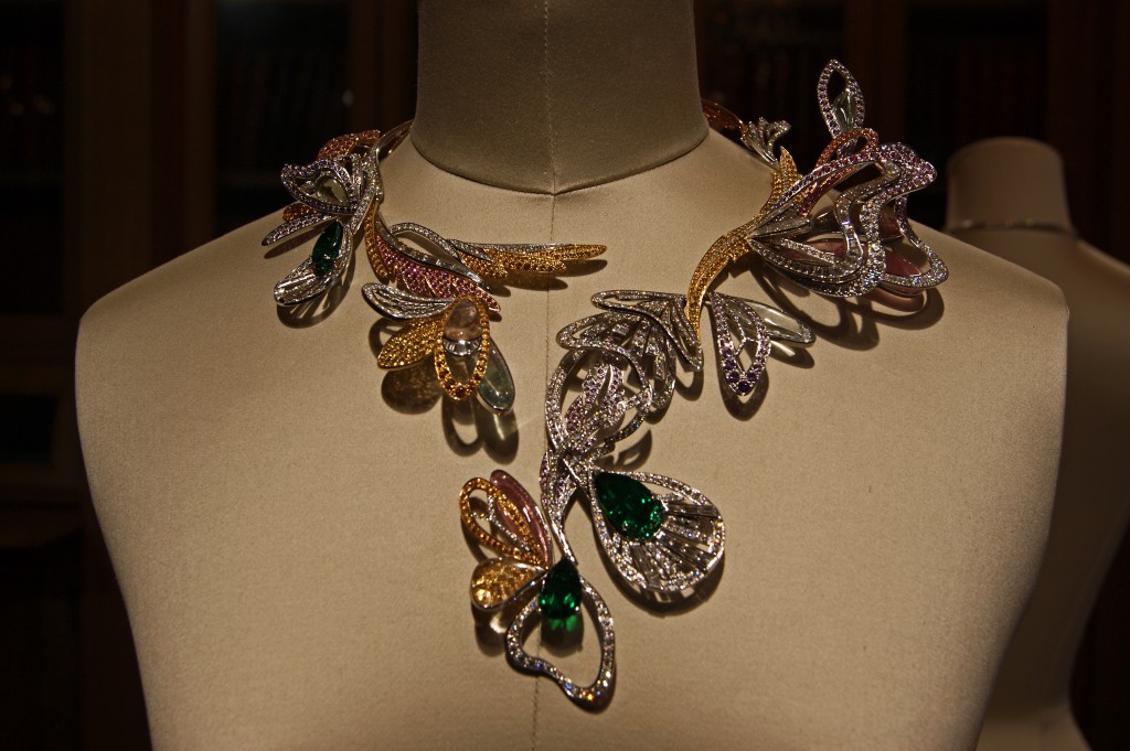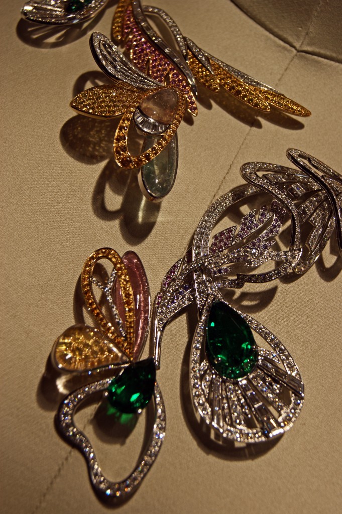 La finesse des émeraudes mêlées aux saphirs de couleur et aux diamants n’en finit plus d’illuminer la pièce. Papillons, libellules et paons sont des animaux chers à la Maison Boucheron. Célébrant la richesse créative de la nature et des artisans, la parure Bouquet d’ailes est un clin d’œil à la fameuse broche Papillon portée par l’immortelle amoureuse des bijoux qu’était Elizabeth Taylor.