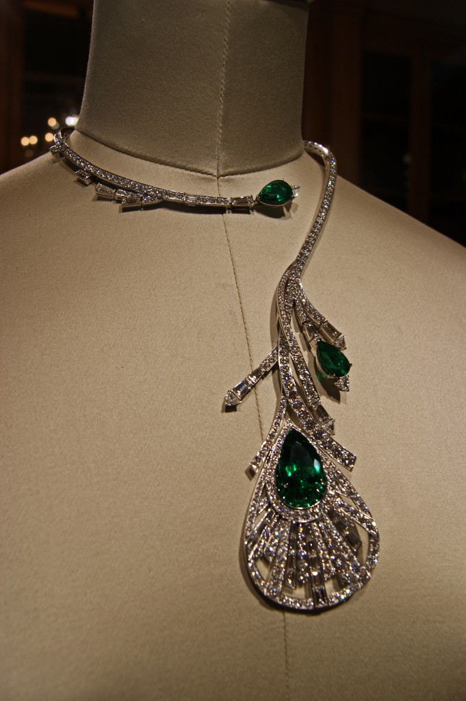 Sans fermoir avec un ressort caché, ce collier s’enroule autour du cou sans l’enserrer grâce à sa volute toute en rondeur. Ses exceptionnelles émeraudes dont l’émeraude principale taillée en poire sont d’un vert incomparable au fond duquel vibre une nuance bleutée.