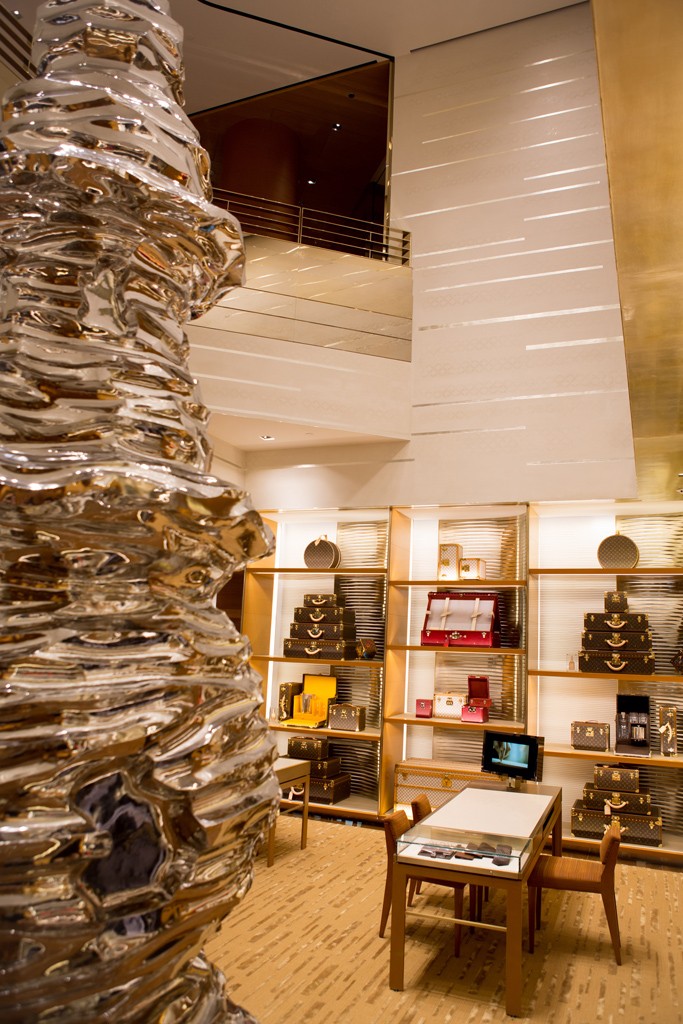Fidèle à l’esprit de la Maison Louis Vuitton, l’Art se mêle à l’Art du Voyage puisque, outre les habituels produits de la griffe, des œuvres et des créations chinoises côtoient le travail d’artistes étrangers qui livrent leur propre vision de la Chine. On peut admirer au pied de l’escalier doré une sculpture en métal poli de l’artiste chinois Qiu Zhijie, appartenant au triptyque Three Pools Mirroring the Moon, inspirée du Lac de l’Ouest de Hangzhou.