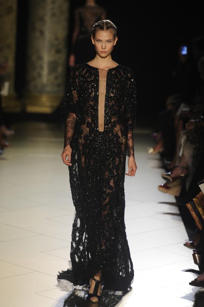Comme pour le prêt-à-porter Automne-Hiver 2013, Karlie Kloss, coiffée d’une couronne de tresses, ouvre le bal de la Couture et foule d’un pas gracieux le sol doré du Palais Cambon. Princesse parmi les princesses, nulle autre qu’elle ne pouvait mettre en valeur cette robe longue en tulle noir entièrement brodé de perles, de paillettes et de dentelle.