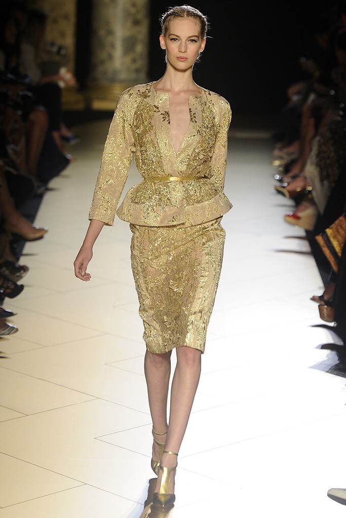 Dévorées de guipures et dentelles, de ramages rebrodés et de pétales mordorés, les silhouettes se dévoilent, une à une, comme incrustées de pierreries. S’effeuillant avec opulence, chaque pièce est l’incarnation couture de parures joyaux rivalisant d’éclats changeants. La taille est fine, délicatement mise en valeur par une fine ceinture d’or.