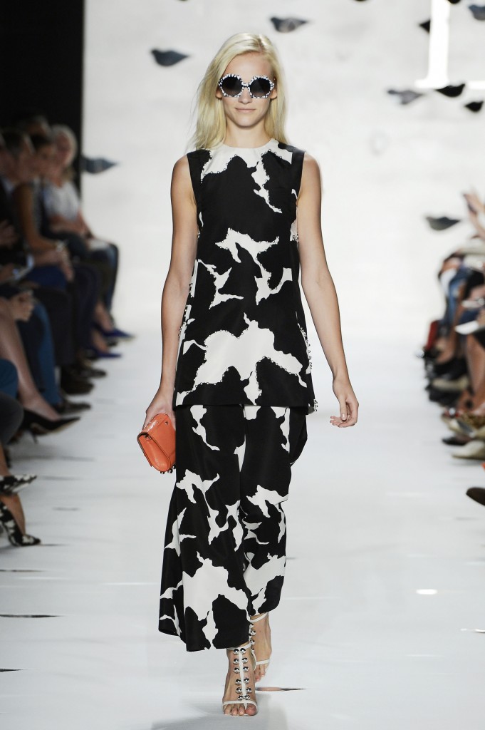Leur première escale entraine la femme Diane Von Furstenberg à Rome, où dans un vrai clair-obscur, elle se retrouve enveloppée de noir et blanc, à l’image du mur du défilé. Dans des imprimés fleuris et printaniers, elle irradie princesse rebelle mais sophistiquée et vit sa dolce vita.