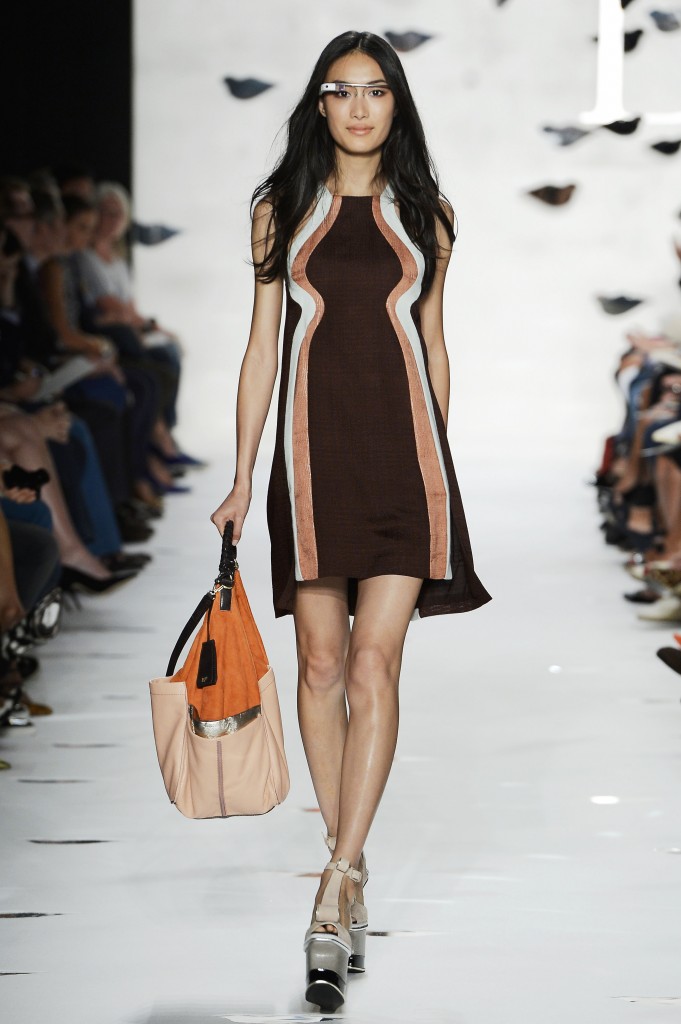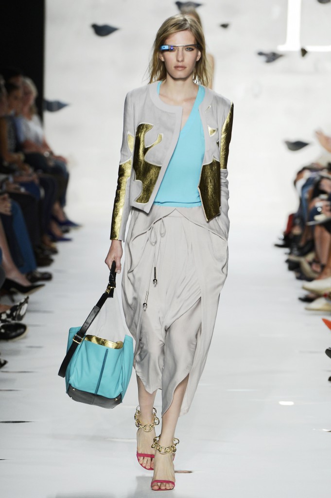 L’événement de ce défilé était le port par plusieurs mannequins du défilé de la dernière création de Google, qui agit en tant que «réalité augmentée» avec des verres analogues à un smartphone avec un appareil photo et écran intégré. Les images captées par les mannequins grâce aux Google Glasses étaient retransmises en direct, véritable plongeon dans la technologie et le regard du modèle.
