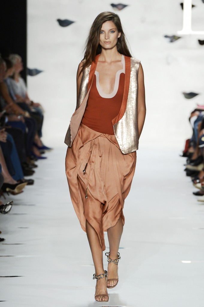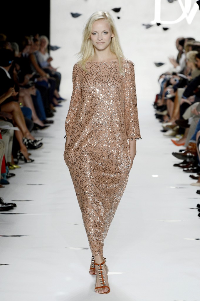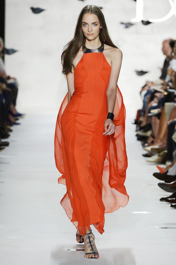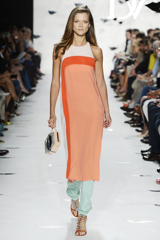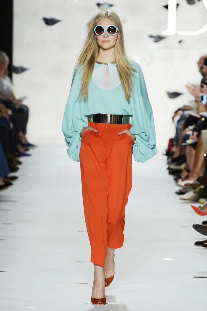 C’est à un défilé résolument tourné vers l’Orient que nous a convié la créatrice belgo-américaine Diane Von Furstenberg ce dimanche 9 septembre 2012. Pantalons façon sarouels, robes caftans, saris soyeux, blouses colorées, jupes sarong et bijoux démesurés nous transportent dans la douce chaleur de Rome au printemps avant de nous plonger dans la torpeur d’un Marrakech aux couleurs chaudes pour enfin nous emmener en pélerinage à Jaipur.