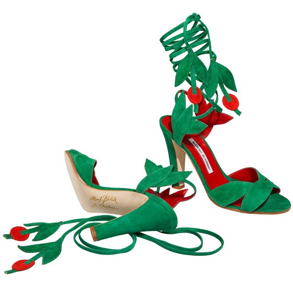 Mélange de vert clair et de rouge, cette chaussure printanière illustre résolument la poésie en mouvement. Ses lanières de feuillage en daim sont parées de cerises et ses 10 cm de talons accentuent la silhouette. Cette paire d’escarpins tout droit sortie d’un jardin romantique ne sera disponible qu’en 60 exemplaires au prix de 650 euros. Pour celles qui se voudraient plus discrètes, elle est également disponible en noir.