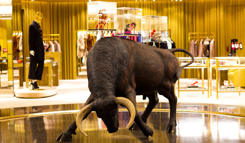 Pièces montées de macarons Ladurée rappelant la collaboration du créateur au film Marie-Antoinette de Sofia Coppola, girafe tachetée pour chaussures en fourrure, souliers baroques sur fond d’assiettes de Fornasetti, cadeaux originaux d’un sapin de Noël, chaque thème semble être choisi pour mettre en valeur chaque chaussure.