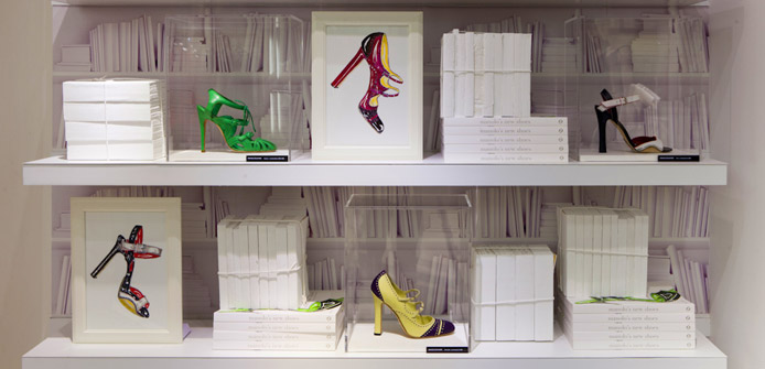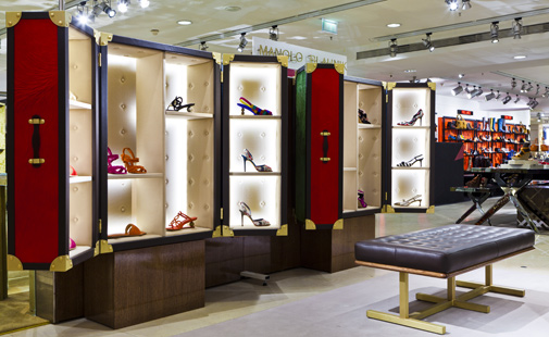 Les créations de Manolo Blahnik sont disponibles en exclusivité au Printemps Haussmann à Paris. D’abord distribués via le corner Maria Luisa, les souliers du créateur ont désormais un shop-in-shop dédié au cinquième étage du Printemps de la Mode. Présentés dans des malles, ces objets de désir sont mis en valeur dans des écrins de toute beauté nous ramenant presque dans l’intimité d’un dressing où chaque paire est mise en valeur.