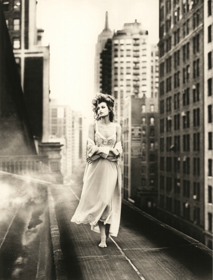 En 1983, La Perla lance le premier body à larges épaules entièrement en dentelle, premier dessous pouvant être porté dessus et met en scène une femme romantique, raffinée et séduisante. Le regard de Marco Emili est presque volé, comme à travers le trou d’une serrure de porte.
