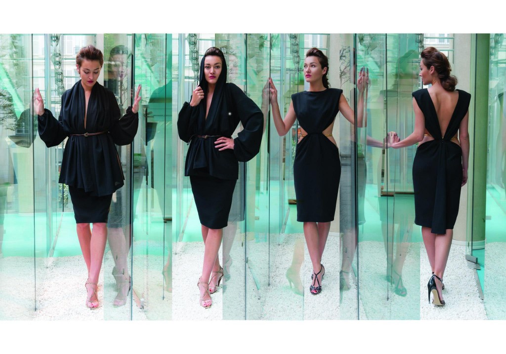 A partir de quelques lignes, l’architecte de formation crée de la matière de manière intuitive en s’inscrivant dans une architecture organique où la construction devient un prolongement du corps humain et de la Terre. Privilégiant les matières luxueuses (cuir d’agneau plongé, satin et crêpe de laine), elle propose sur le Lab une ligne entièrement noire, inspirée par l’élégance rock et punk du groupe THE KILLS, jouant sur des effets de contraste entre mat et brillant.