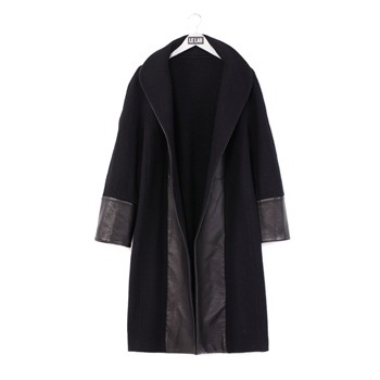 La pièce forte de la collection : un manteau au col châle en drap de laine aux empiècements en cuir d’agneau plongé avec sa ceinture à nouer.