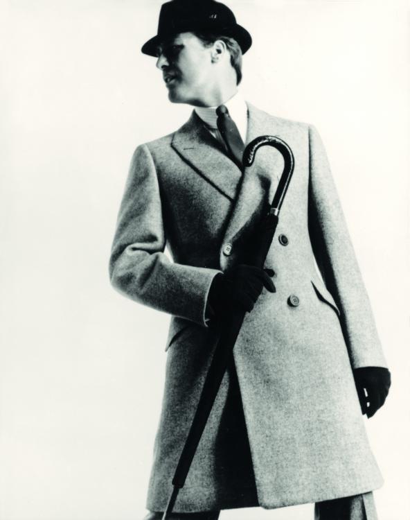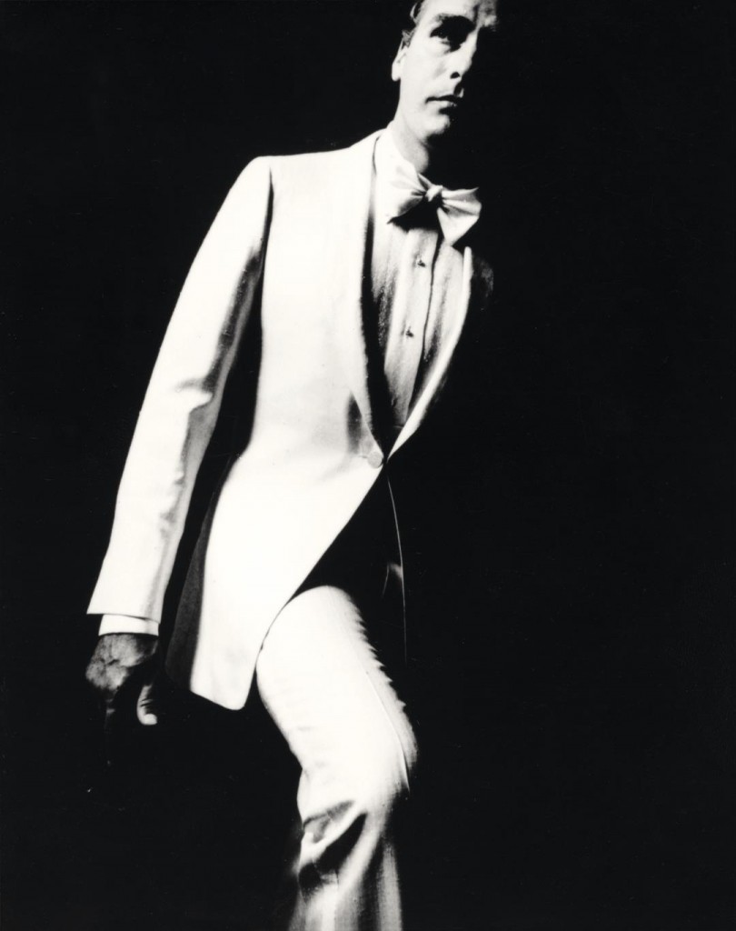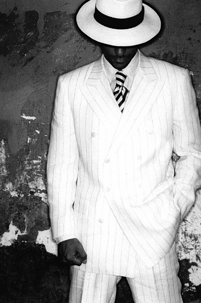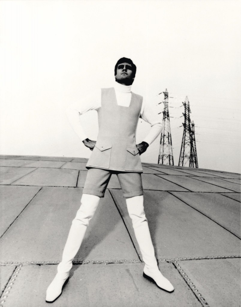 Avec ses vêtements sur mesure ajustés et donnant libre cours au mouvement, il révolutionne la garde robe masculine et son vocabulaire; du costume rayé au smoking blanc et à la saharienne jusqu’aux costumes futuristes et longues cuissardes en vinyle.