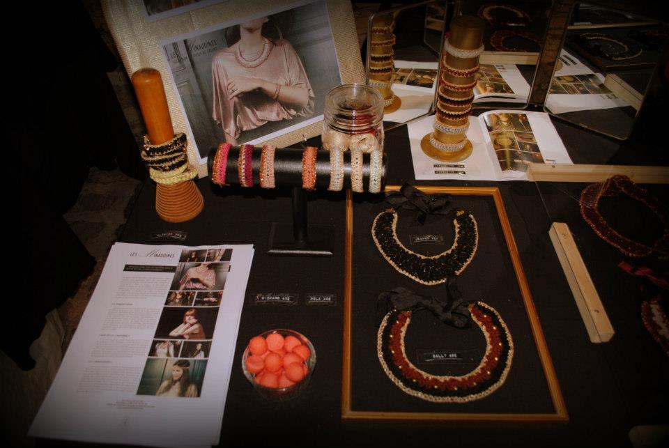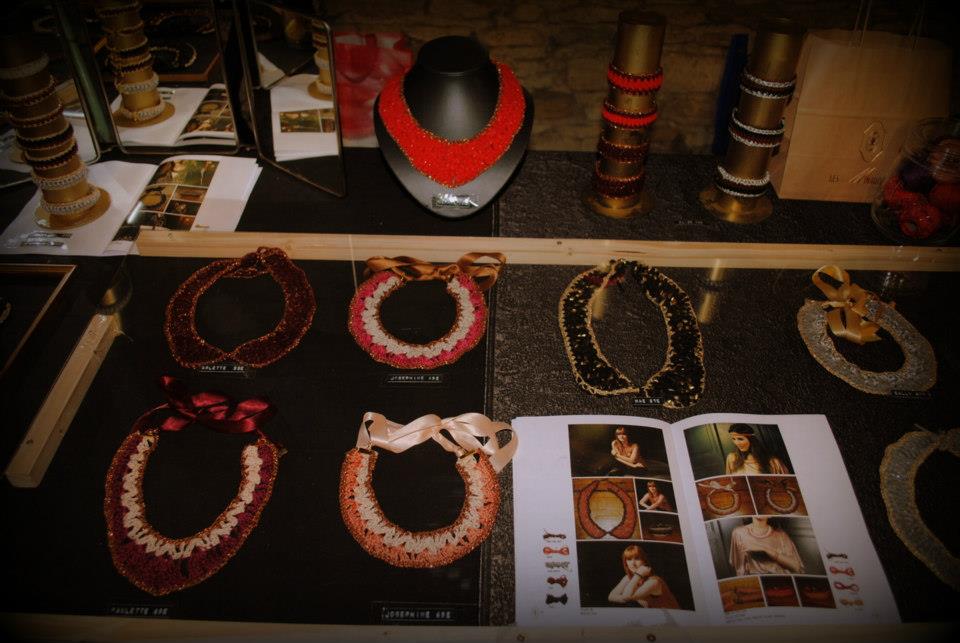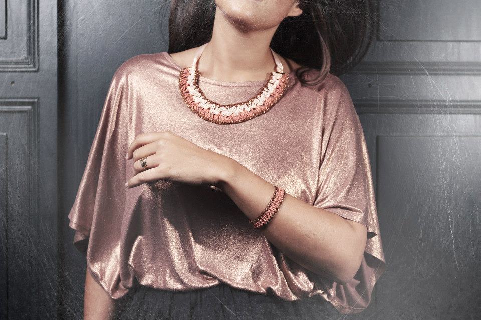 Détonant dans l’univers policé des accessoires, la marque propose une déclinaison de bijoux soignés en trois gammes de couleurs : des colliers inspirés du col Claudine, des bracelets fins mais efficaces et des bijoux de tête à l’inspiration très années folles.