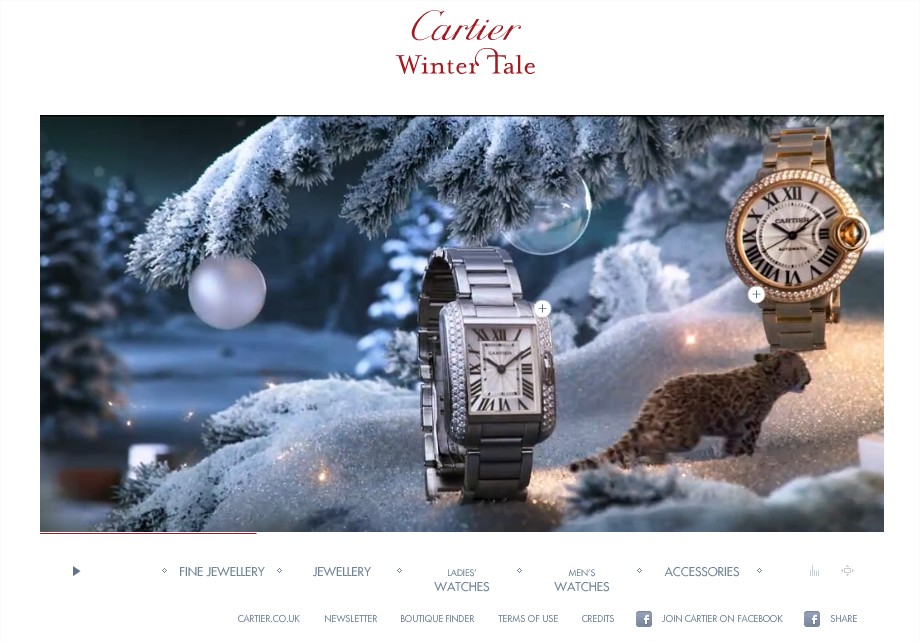 Jouant à cache-cache dans la neige, les deux petites panthères s’aventurent dans cette forêt enchantée et nous entrainent dans un fabuleux et féérique voyage dans l’univers du joaillier et horloger Cartier.