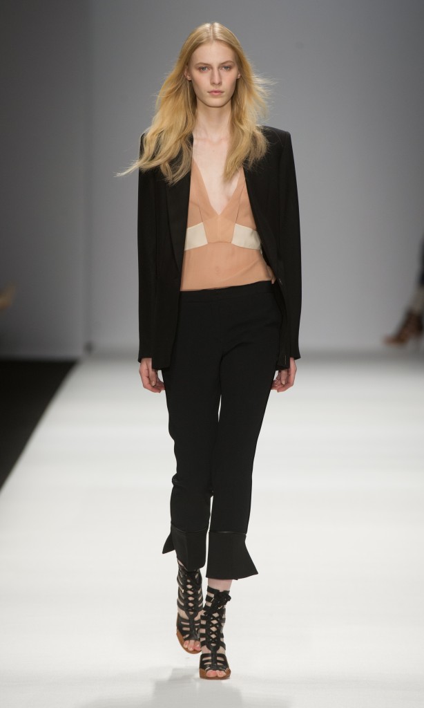 Dès les premiers passages, le ton est donné, la femme Vanessa Bruno exhale la sensualité dans une série de costumes aux vestes larges impeccablement coupées, portées sur des blouses très bohème. Le pantalon est droit voire serré, remonte au niveau de la cheville et est relevé d’un simple liseré satiné ou d’un cordon apparent.