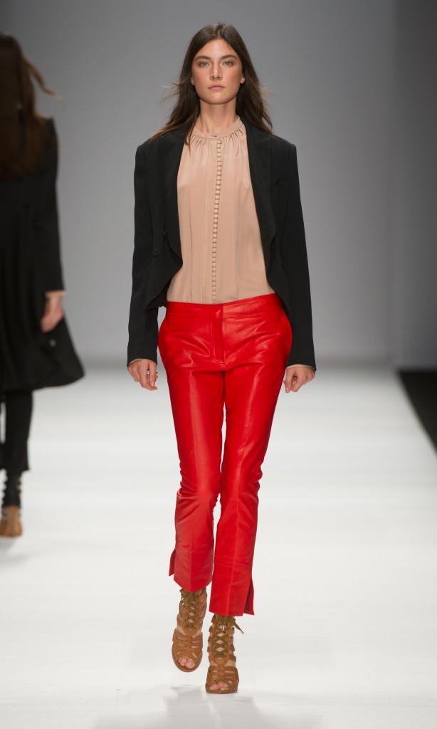 Vanessa Bruno nous prouve que le rouge n’est pas à mettre de côté pour la prochaine saison. La pièce forte de ses premiers passages : un pantalon 7/8 en cuir dont le rouge incandescent en fera certainement craquer plus d’une. Le perfecto retrouve une seconde jeunesse dans ce cuir rouge si attirant.