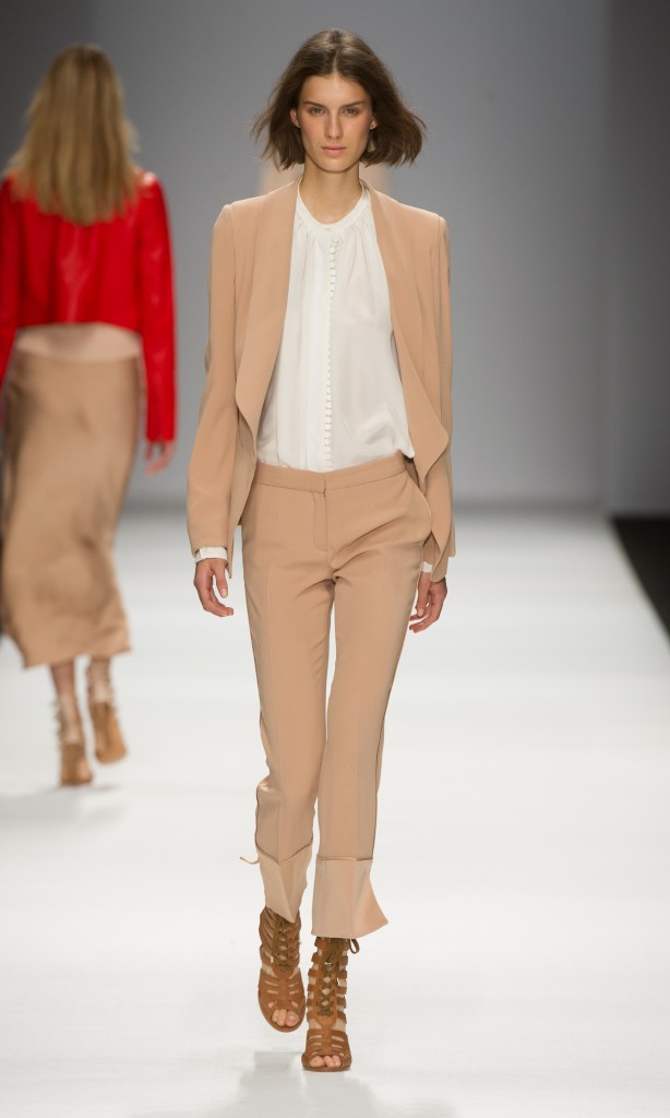 Très vite, le pantalon se fait plus discret, pour laisser place à une jupe entre deux longueurs, très fluide réinventant le tailleur estival. Les tons nude font leur apparition pour faire place à une touche de romantisme bienvenue.