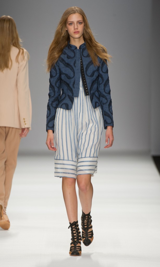 La petite robe légère se fait d’abord discrète, portée sous une veste brodée d’épis de blé. Dans des tons nude ou bleu clair, elle est parsemée de rayures verticales et horizontales et se porte avec des sandales montantes.
