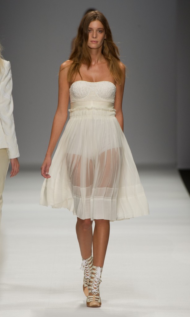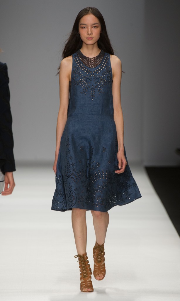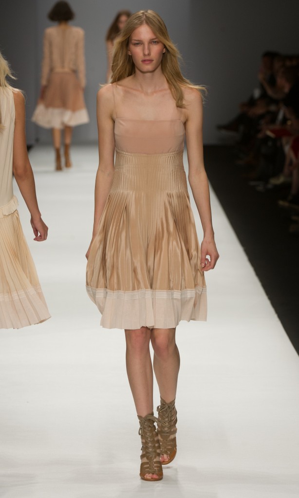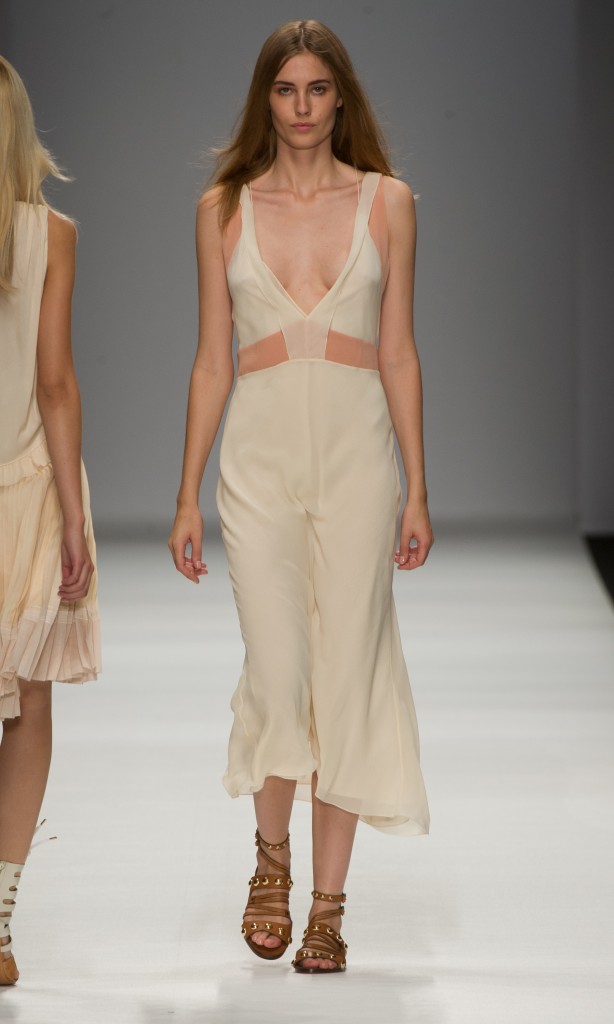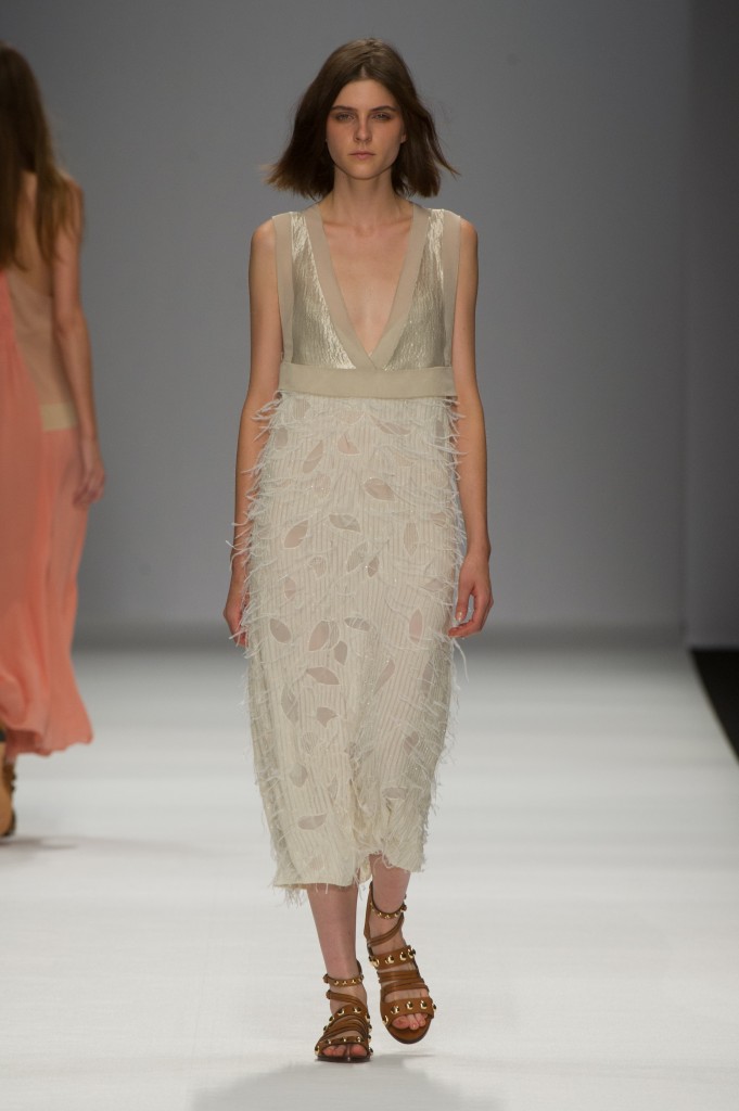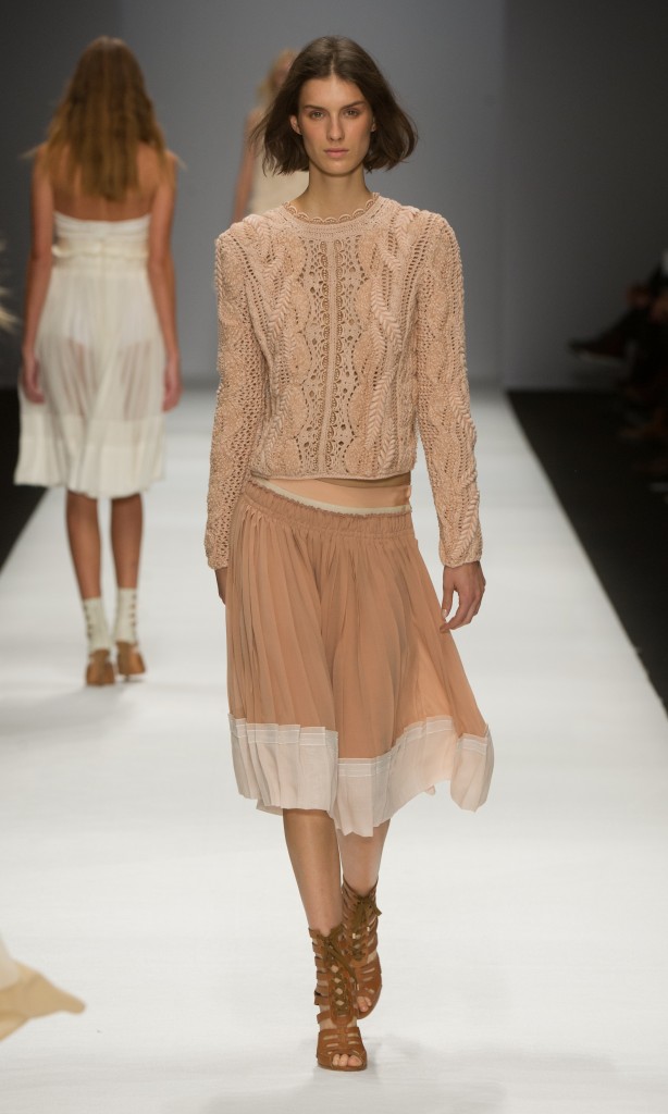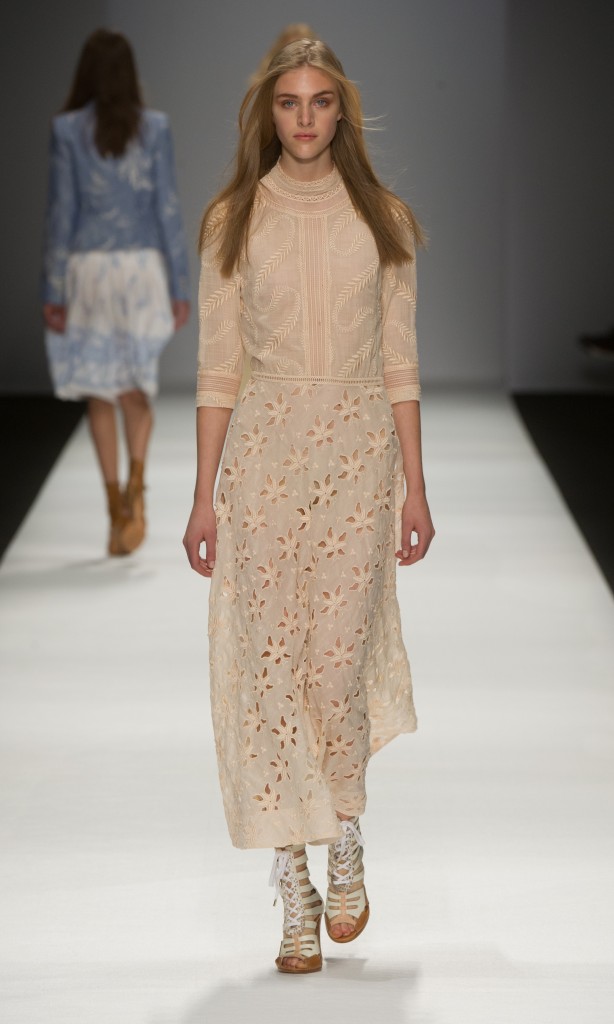 Broderie anglaise, dentelle et soie satinée apportent une touche de douceur à chaque passage, impression confirmée par une palette de couleurs où prédominent les teintes nude. Le blanc cassé, le beige et un rose poudré romantique enrobent chaque silhouette de délicatesse à peine réveillée par quelques touches de bleu.