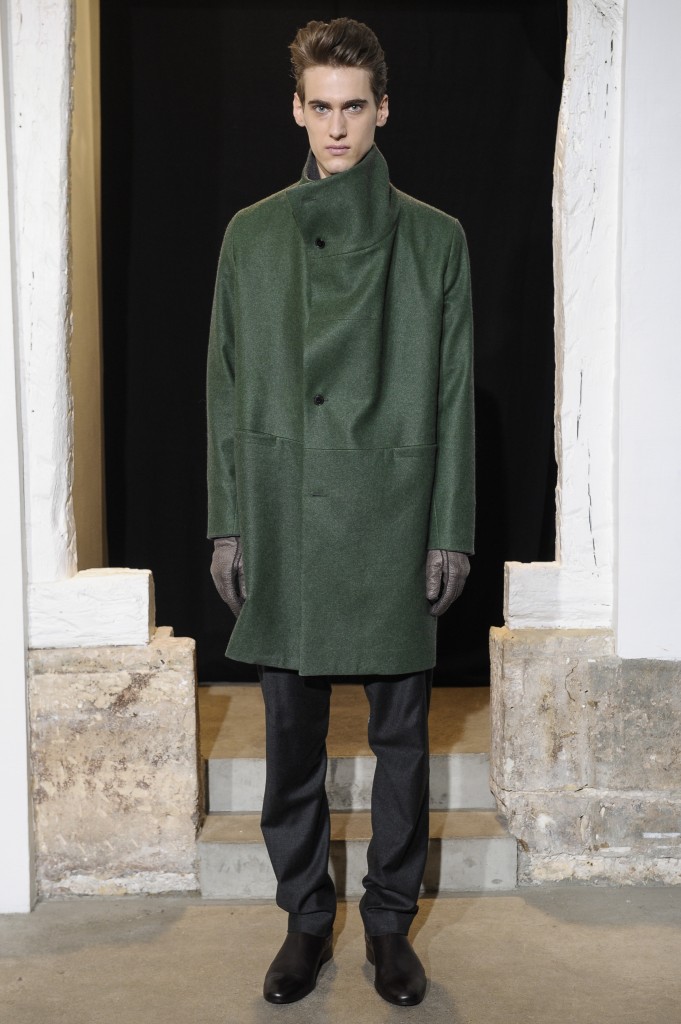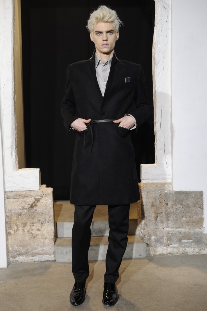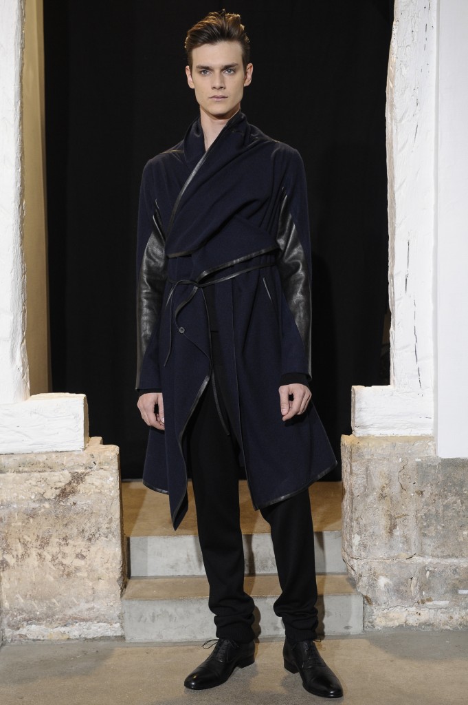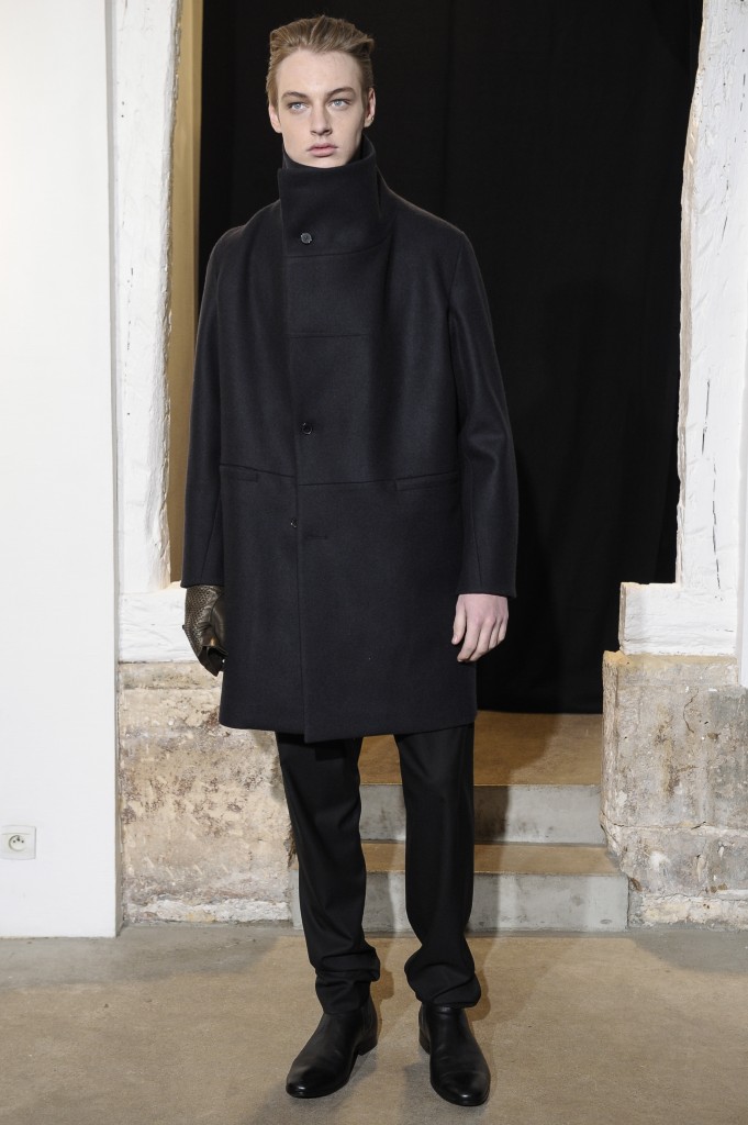 S’inspirant du vestiaire féminin, Gustavo Lins nous a proposé sa version masculine du kimono, qu’il a étudié. Vestes et manteaux sont souvent fermés par une ceinture en cuir box noir ornée d’une boucle en corne noire, qui reprend le maintenant très identifié “T” à l’envers, rappel de la règle d’architecte devenue depuis ses débuts la référence graphique de la marque.
