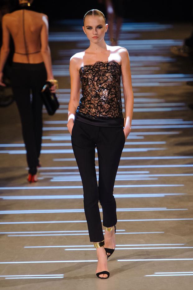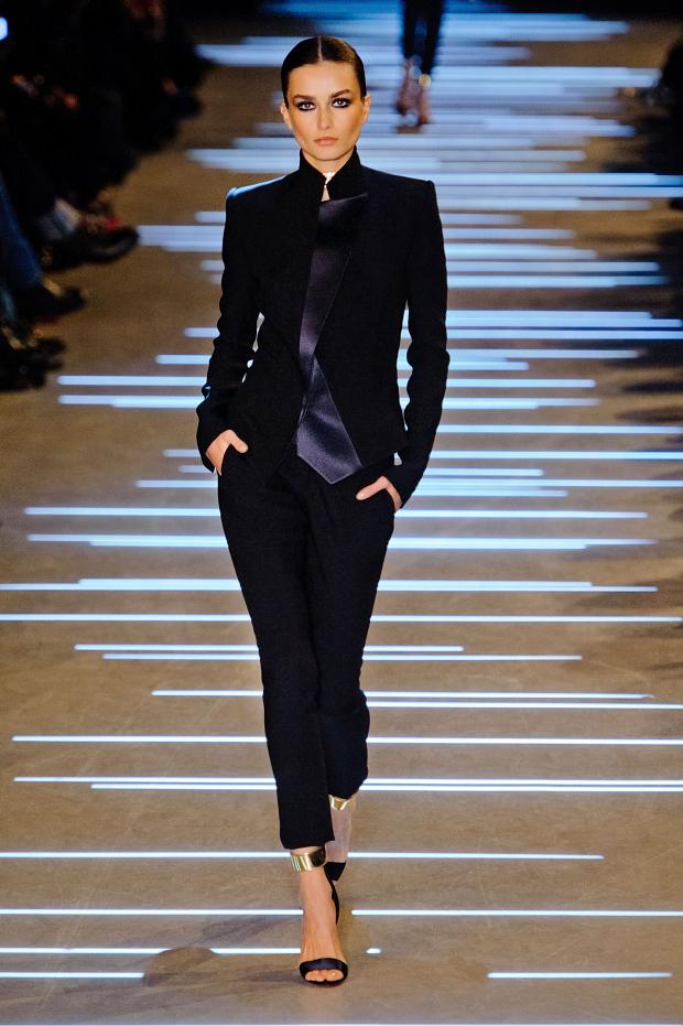 Les broderies soulignent la perfection des coupes, le smoking se réinvente d’un revers pour finir par s’ouvrir complètement. Les épaules sont marquées et les vestes cintrées se portent déposées comme une caresse sur des robes fourreaux à la fente vertigineuse.