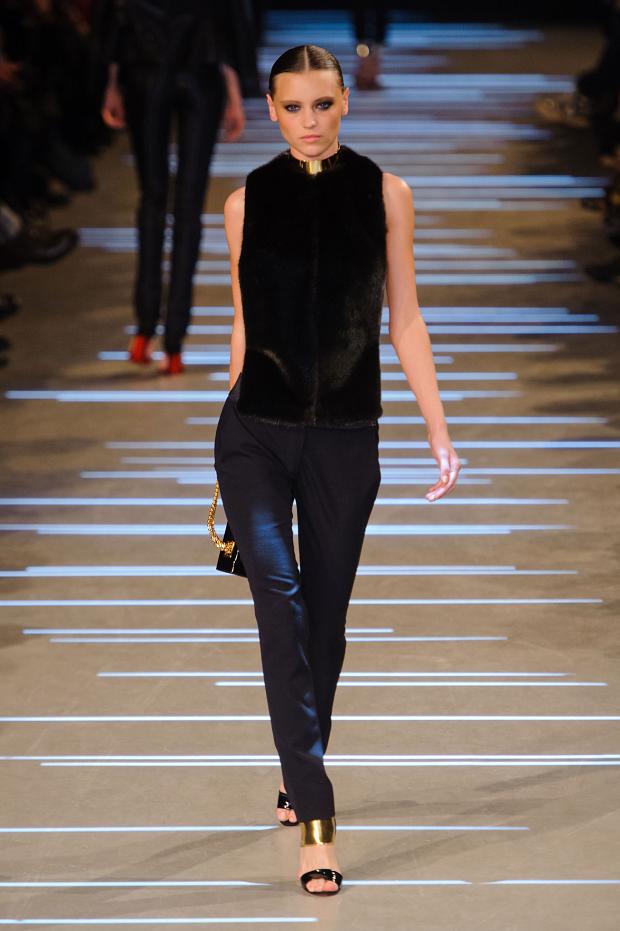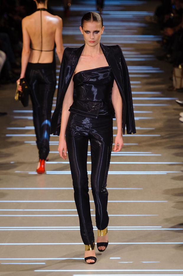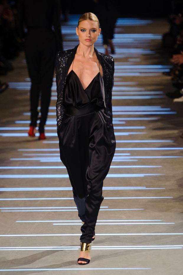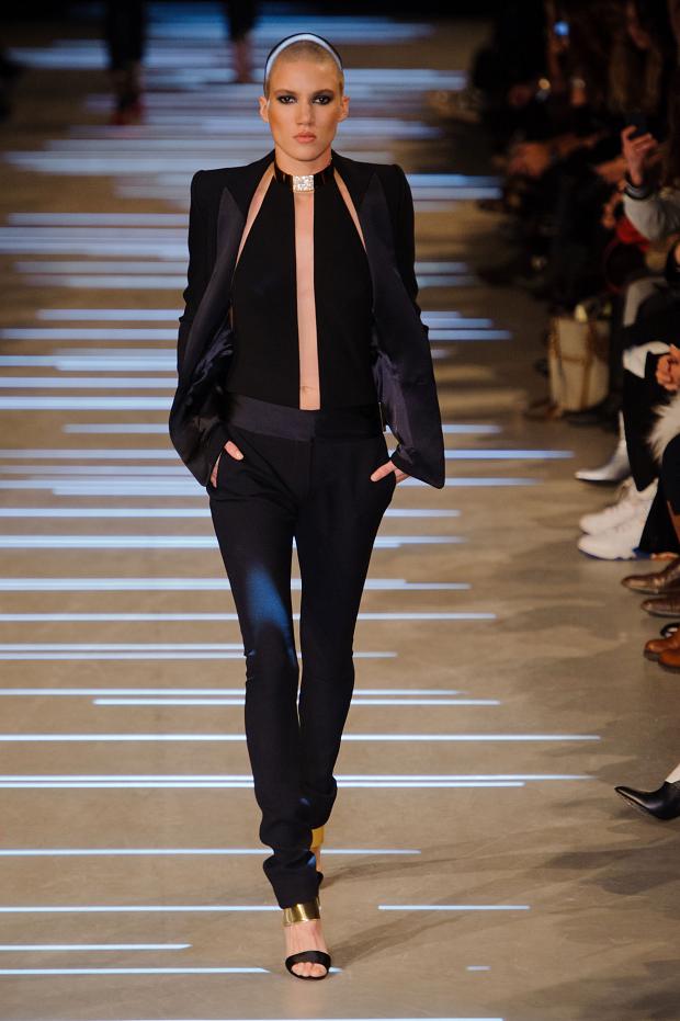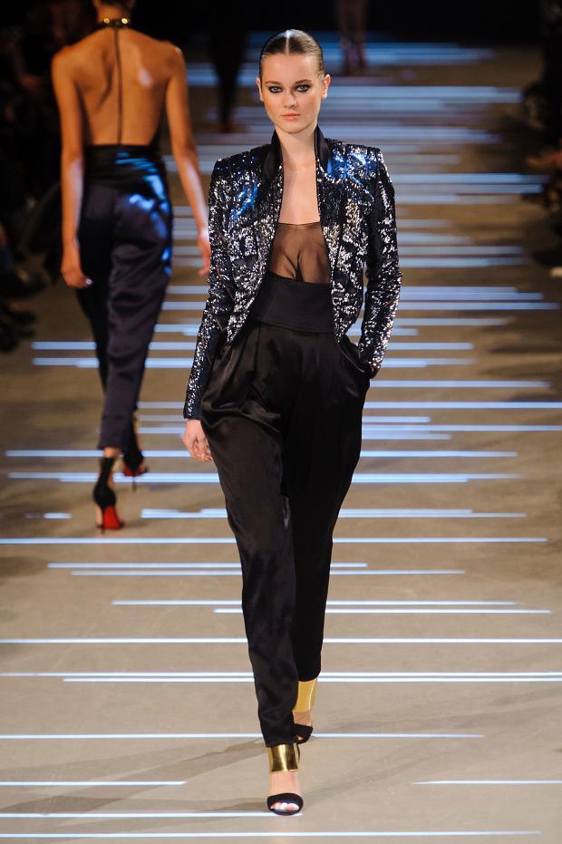 Structure et perfection des lignes guident une collection beaucoup plus sombre que la précédente dans laquelle le créateur semble affronter sa noirceur dans une féérie de noir, de bleu nuit et de brillance. Tailleur et smoking sont retravaillés à l’extrême nous offrant des variations de choix et une intéressante réflexion sur le noir et les jeux de lumière.