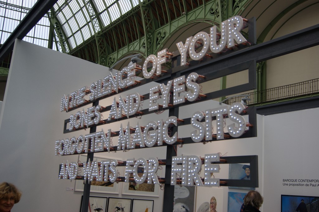 L’installation lumineuse de l’artiste anglais Robert Montgomery proposée sur le stand de la galerie genevoise Analix Forever. Ces écritures poétiques établissent un lien entre les êtres, comme une pause dans un quotidien saturé de communication numérique dans un acte purement poétique.