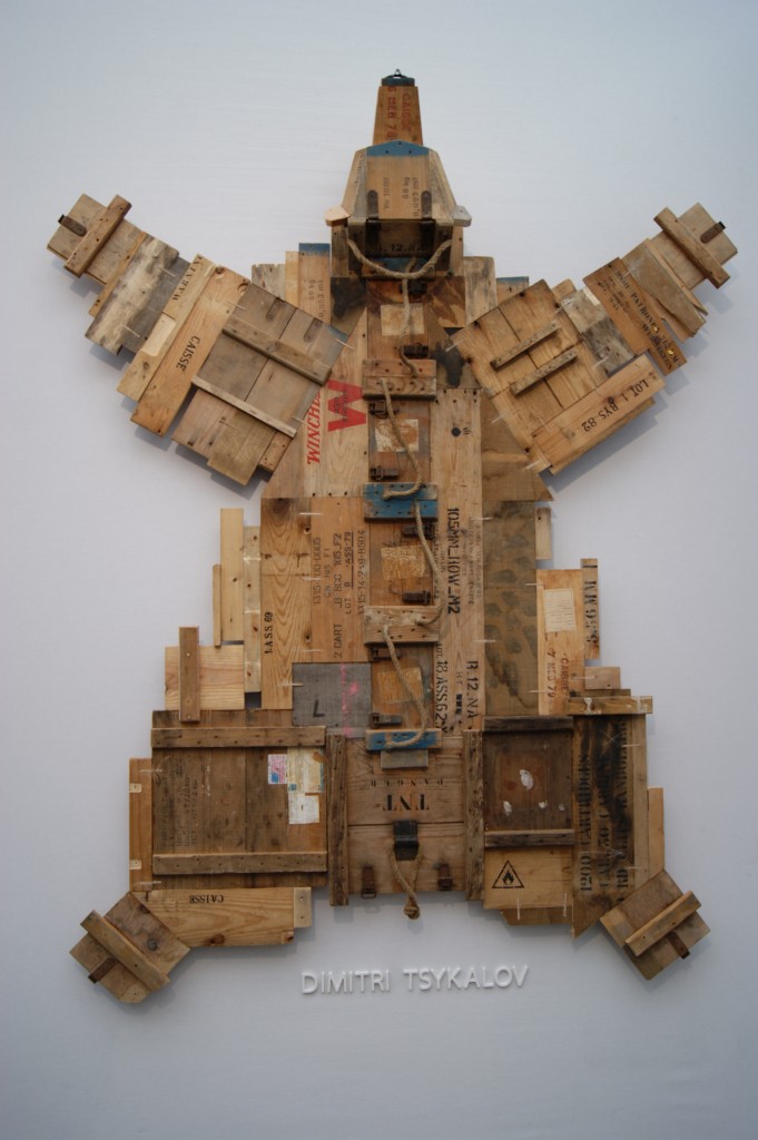 L’artiste russe propose une seconde œuvre Skin, toujours faite à partir de bois mais faisant ici référence à l’animalité et à la guerre. Constituée de caisses à munitions vides venues du monde entier, cette peau d’ours est en réalité une cartographie du marché d’armes nous renvoyant le reflet d’une société guerrière où chacun veut se faire la peau.