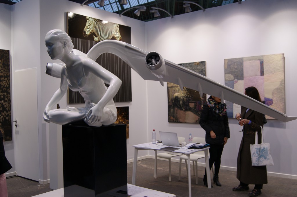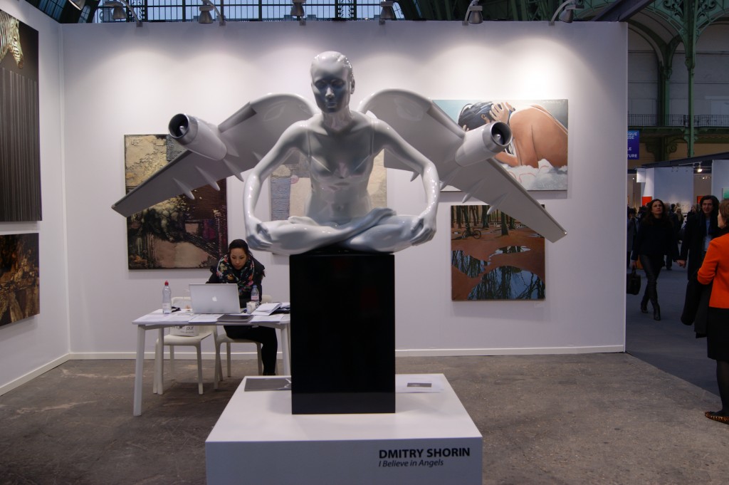 Ainsi, l’ange déployant ses ailes pourvues de réacteurs d’avion proposé par l’artiste russe Dmitri Shorin survole la foire avec son ange exposée sur le stand de la Galerie Erarta.
