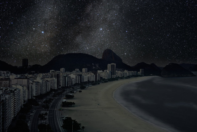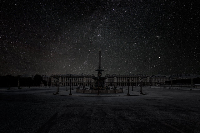 Les photographies très sombres de Thierry Cohen nous plongent dans la contemplation des paysages urbains de New York, de Sao Paulo, de Shanghai ou Paris sous un ciel étoilé impossible à voir.