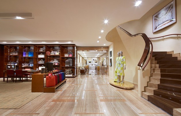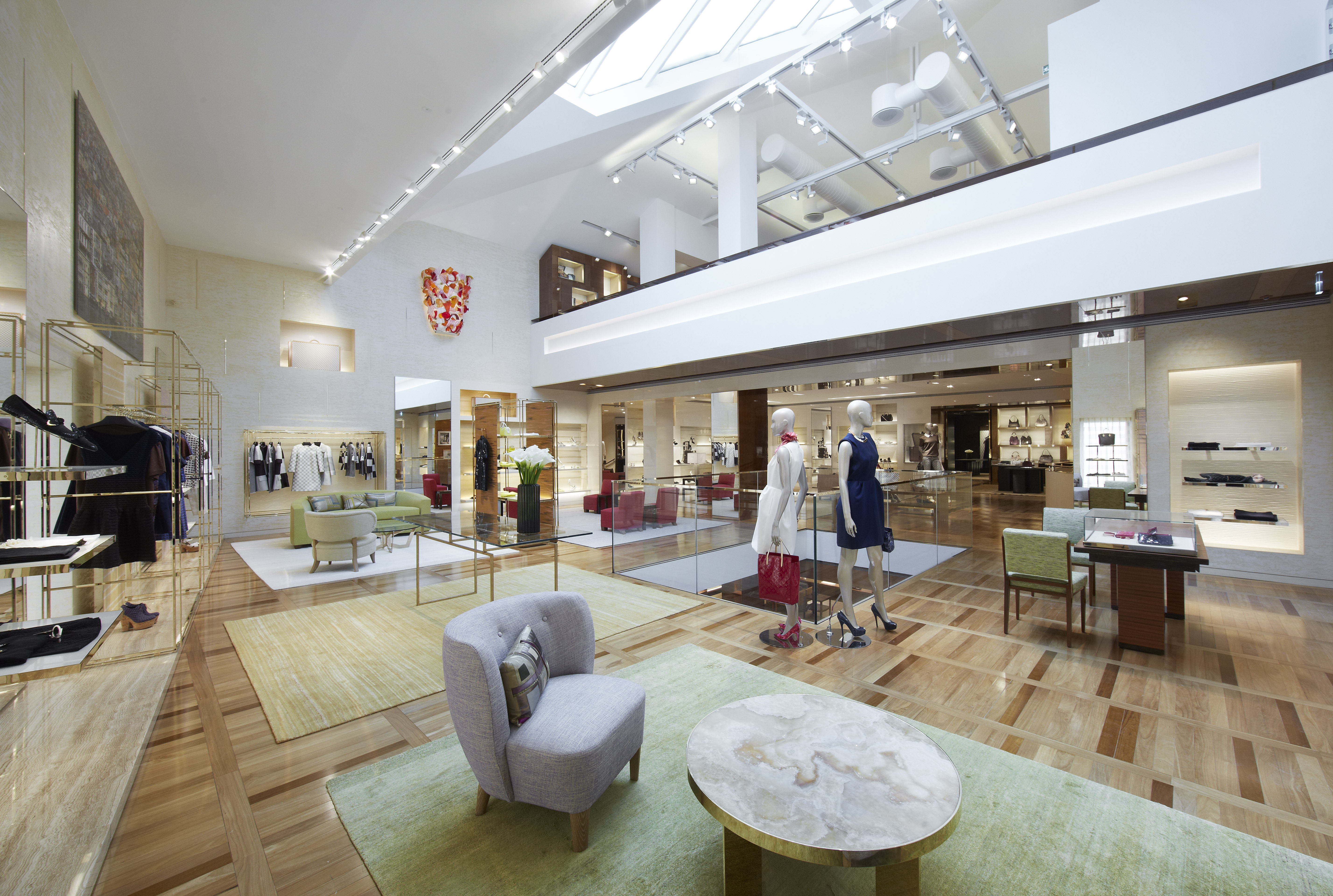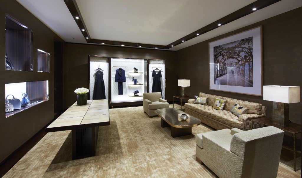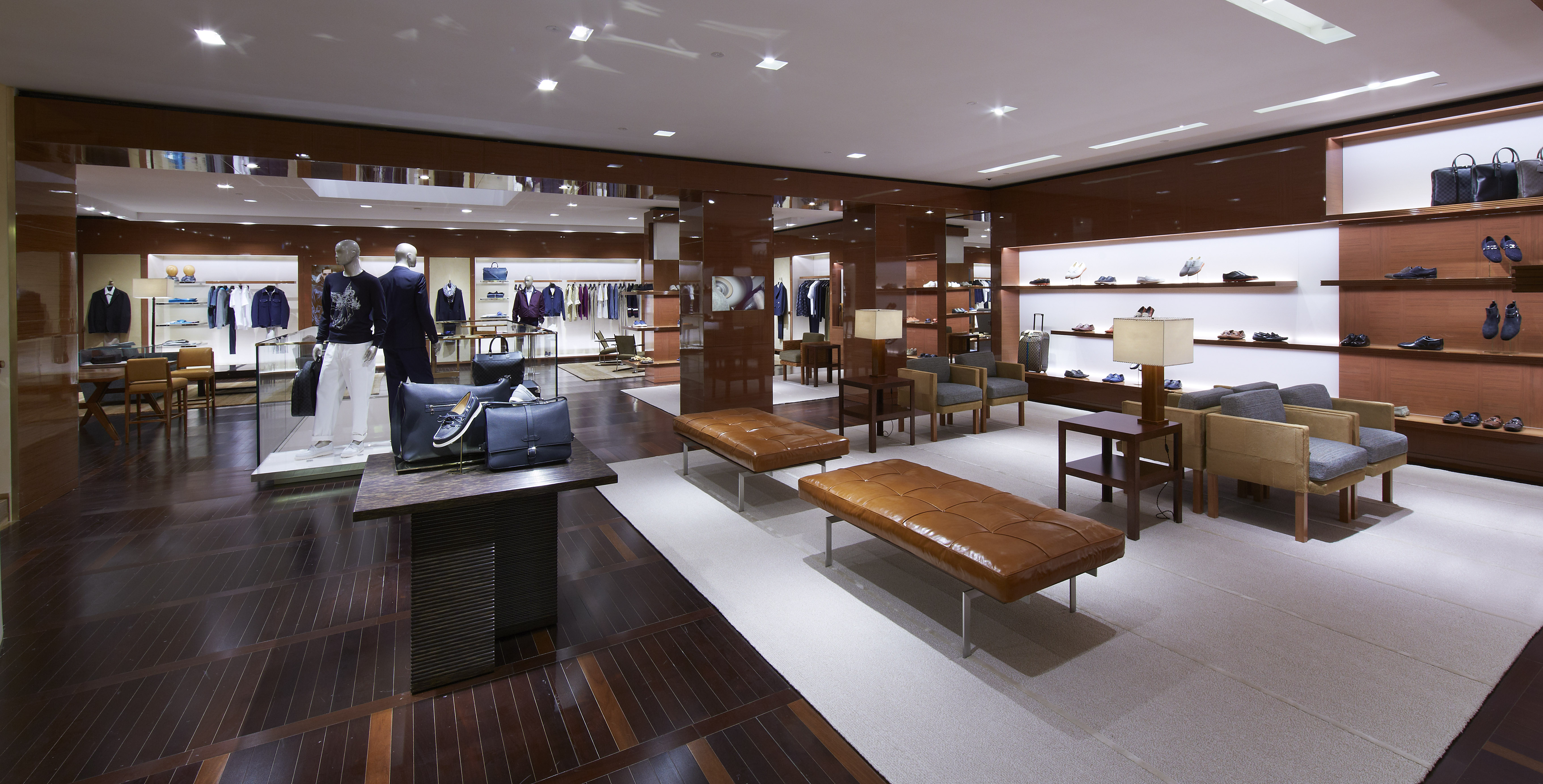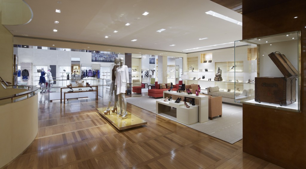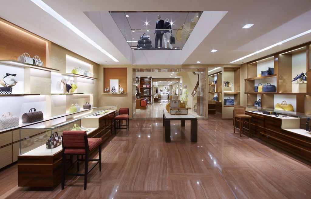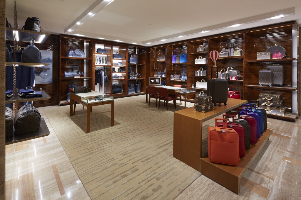 Réalisée avec la collaboration de l’architecte Peter Marino, ce lieu d’exception réunit la mode et l’art entre modernité et tradition. Une fois le portique franchi, on pénètre dans un vaste hall ouvert, avec un jeu d’ombres et de lumières rappelant l’iconique Damier. Les boiseries sombres des comptoirs contrastent avec la patine ivoire des murs.