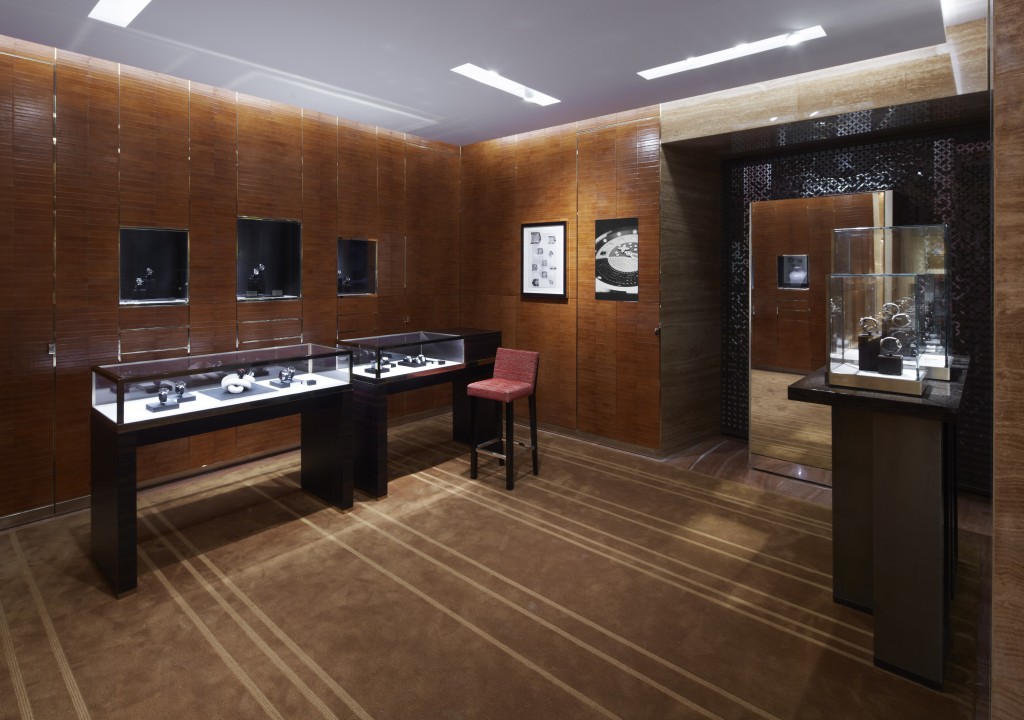 Pour celles en quête de discrétion, l’étage abrite un salon particulier dissimulé derrière de grandes portes en ébène de Macassar. Le moindre détail a été pensé pour vous offrir une expérience d’achat très exclusive. Les murs en stucs vénitiens striés de bronze donnent la réplique à de larges parois capitonnées à l’image de la fameuse Malle pour Dames de la Maison.