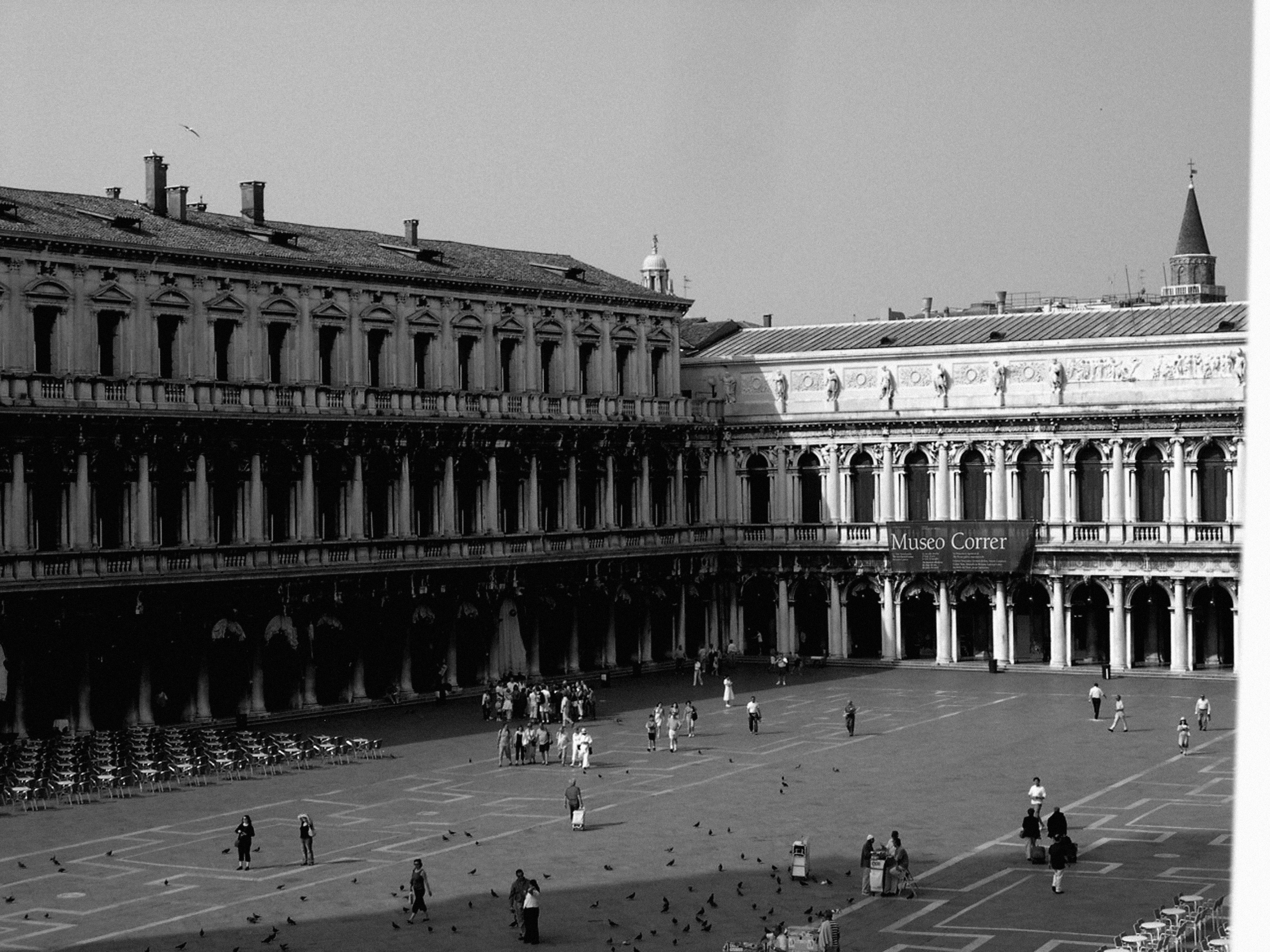 A Venise, le ciel se complaît dans un azur légèrement grisé, qui par un curieux artifice charge le paysage de teintes subtiles, de reflets troublants baignant l’architecture de lieux séculaires dans une ambiance surannée hors du temps.