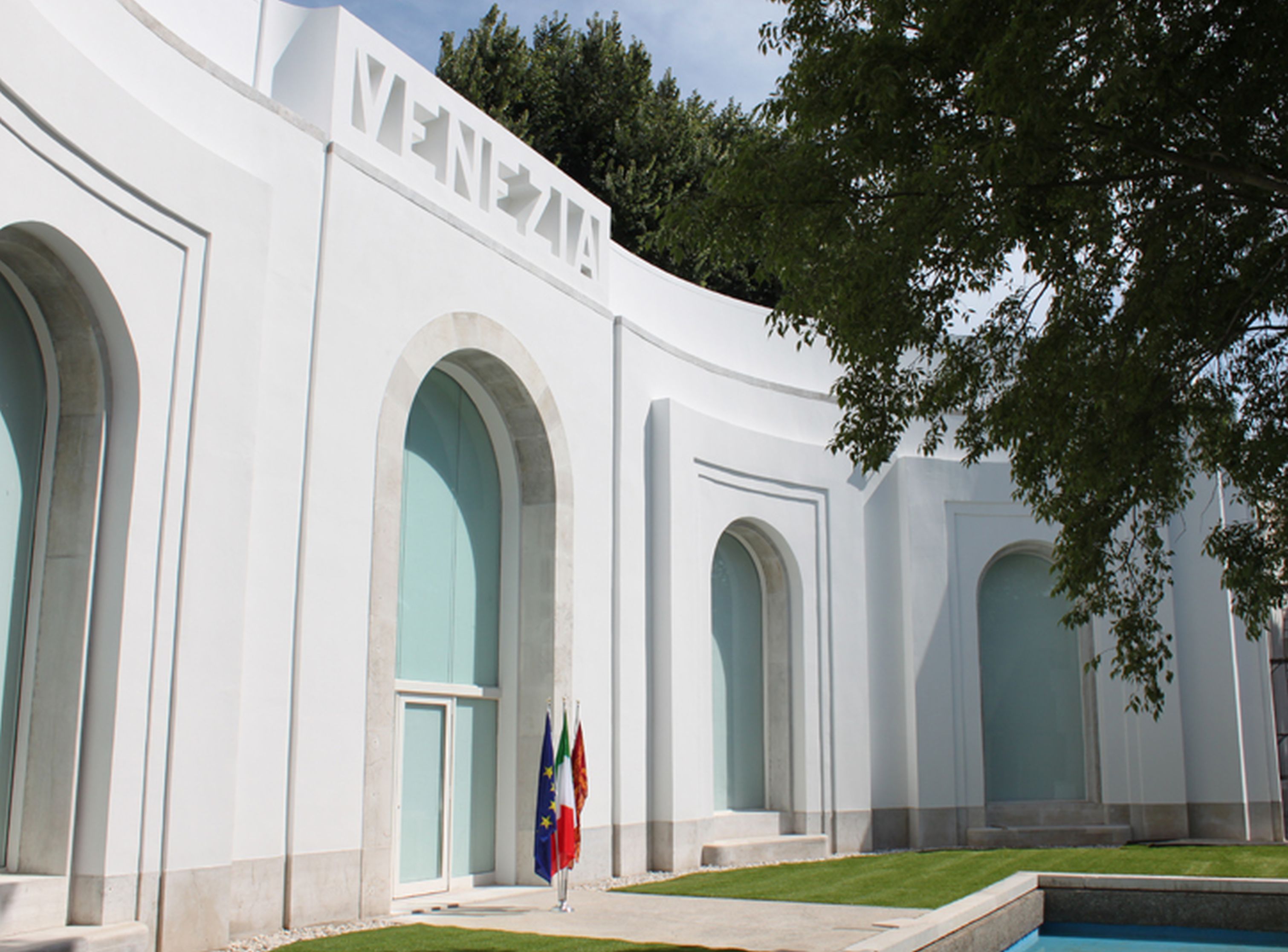 Ce lieu n’a pas été choisi au hasard, il fallait un lieu chargé d’histoire et d’art dans la vraie tradition vénitienne. On reste saisi par la vision de ce palais monumental imaginé par l’architecte Brenno del Guidice en 1936 afin d’accueillir la Mostra.