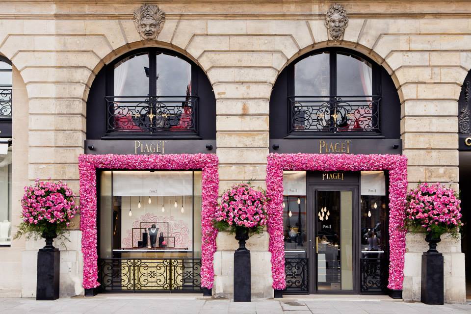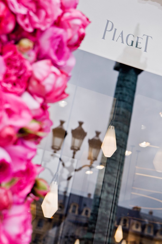Rendez-vous était d’abord donné au 16 Place Vendôme pour découvrir la première surprise de cette journée d’exception. Les vitrines de la boutique Piaget sortaient enfin de leur mystère pour se parer d’un élégant tapis de roses.