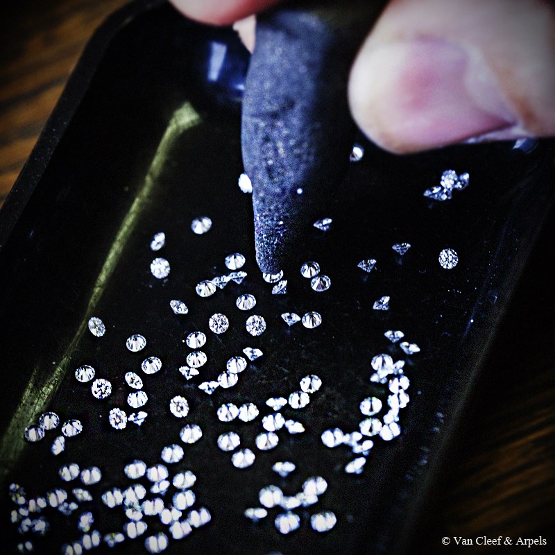La première étape est la sélection des diamants. Le département de gemmologie de Van Cleef & Arpels sélectionne chaque pierre selon les critères de qualité les plus stricts : D et E pour la couleur et IF et VVS pour la pureté.