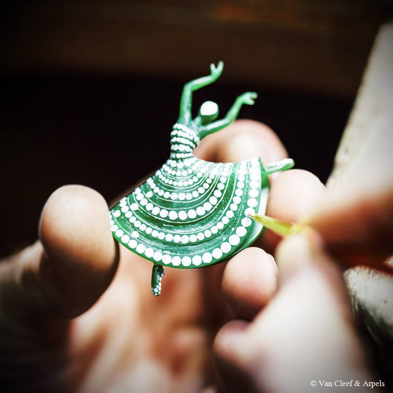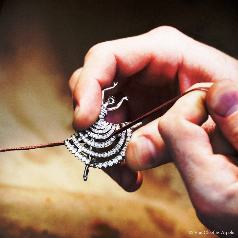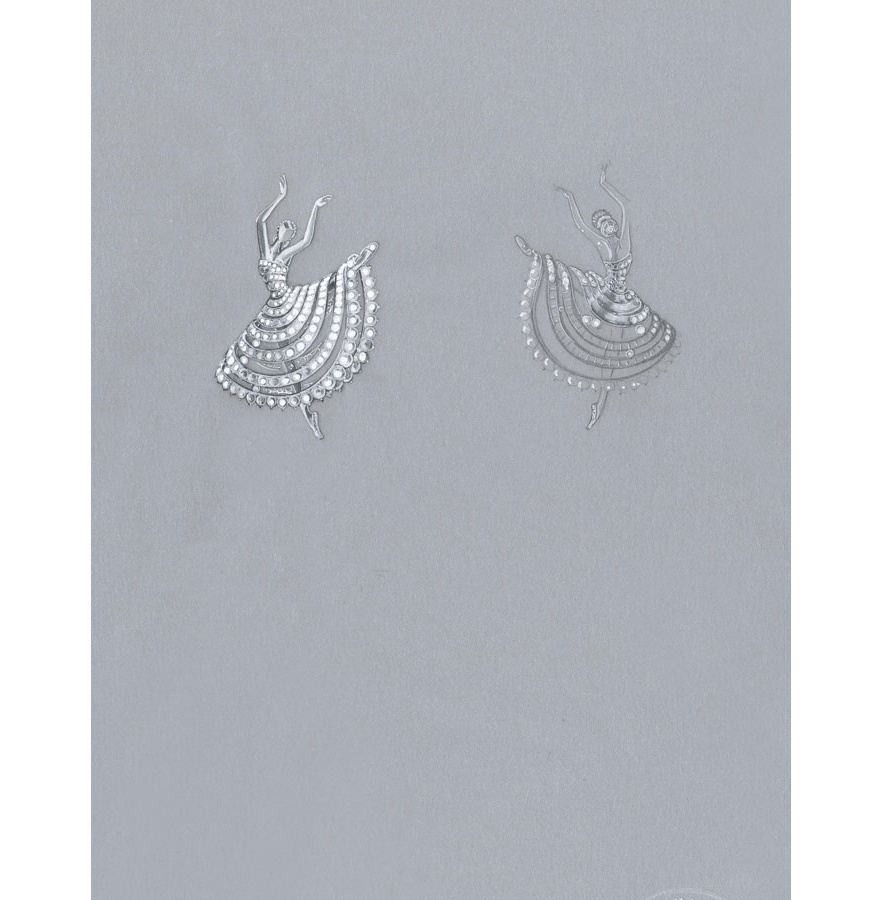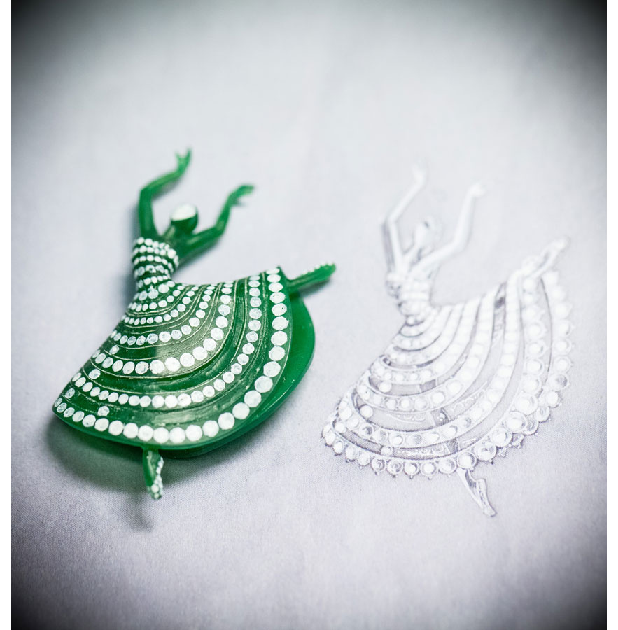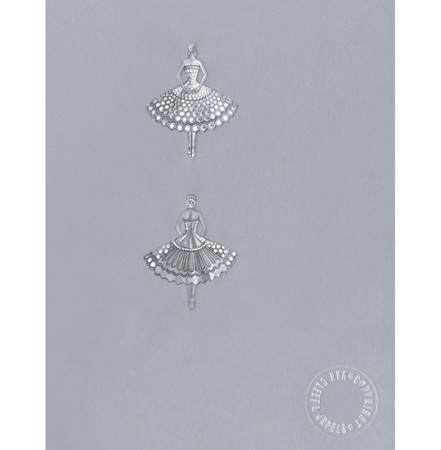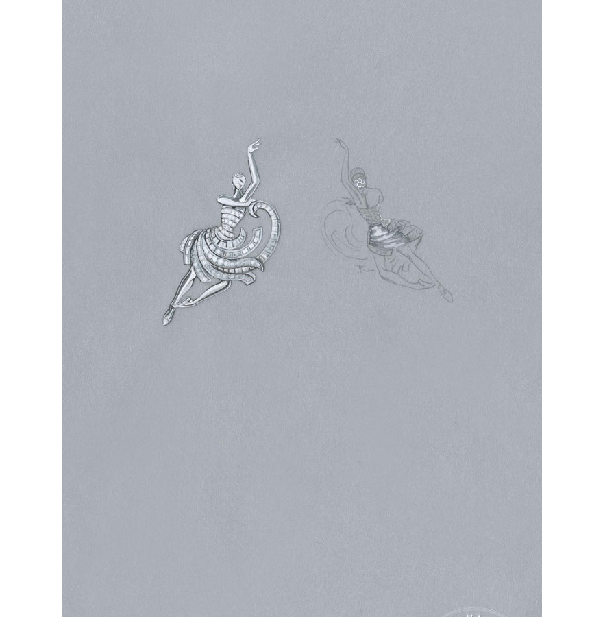 La première ballerine fascine par son mouvement si pur et gracieux figé pour l’éternité. Comme pour toutes les ballerines de la Maison, le visage est représenté par un diamant taille rose. Un modèle en cire verte est d’abord effectué sur lequel l’artisan va pouvoir identifier la position de chaque diamant constituant le tutu et le bustier.