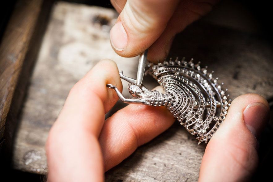 Puis vient le moment d’ajuster les pierres sur la structure en or blanc de la création, véritable âme de la pièce.