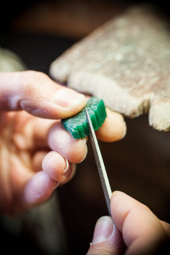 Afin de préparer le sertissage, la structure de pierres est dessinée sur la maquette en cire verte.