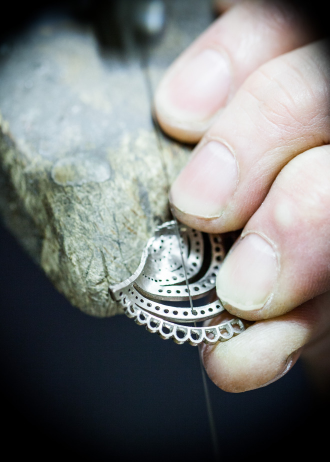L’assemblage des différentes parties de la structure en or blanc, véritable colonne vertébrale du bijou, nécessite une précision d’orfèvre.