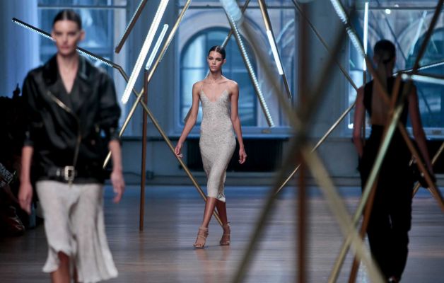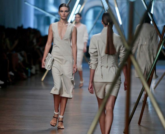 Le nouveau directeur artistique du label Boss Woman a eu cette saison une approche plus minimaliste pour sa collection éponyme s’ouvrant sur des silhouettes brillantes dans des teintes douces.