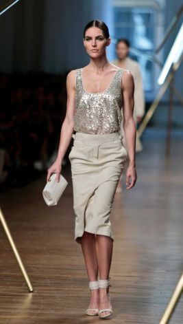 Pour le jour, les blouses de crêpe au col rond et aux poches plaquées forment une parfaite association avec des shorts ou des pantalons droits tandis que les robes du soir brodées métalliques ou à la somptueuse traîne scintillent de mille feux.