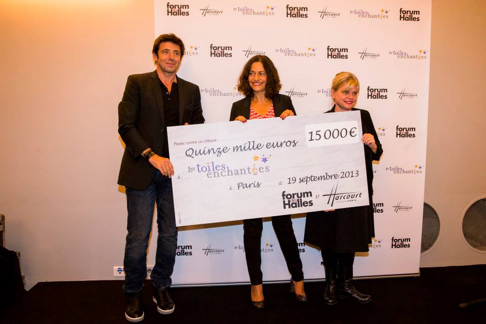 Lors du vernissage, les deux stars ont remis un chèque de 15 000 € représentant l’ensemble des bénéfices de l’opération reversée par le Forum des Halles et Studio Harcourt à Gisèle Tsobanian qui dirige l’association Les Toiles Enchantées dont le Président d’honneur est Alain Chabat.