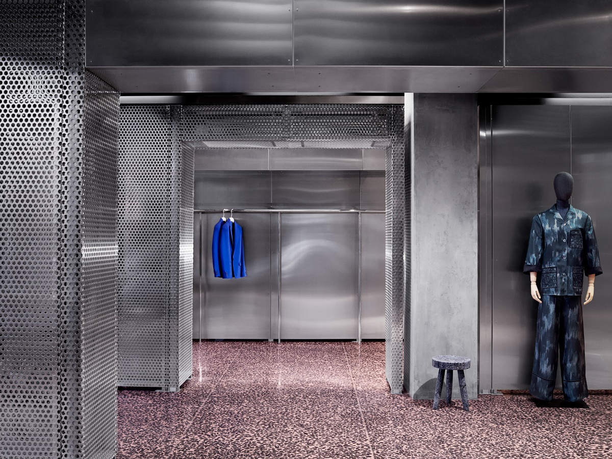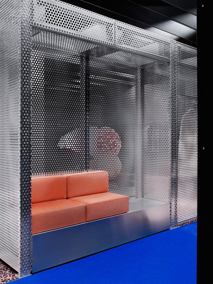 L’espace qui s’étend sur 5 000 mètres carrés joue avec les matériaux et les textures, combinant des parois en aluminium poli et des sols en terrazzo rose dans une interprétation moderne de l’atelier d’artiste.