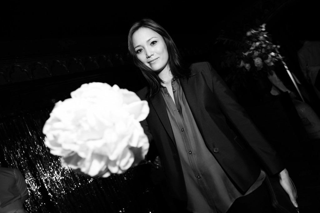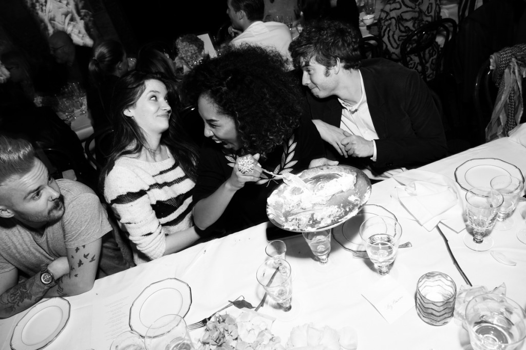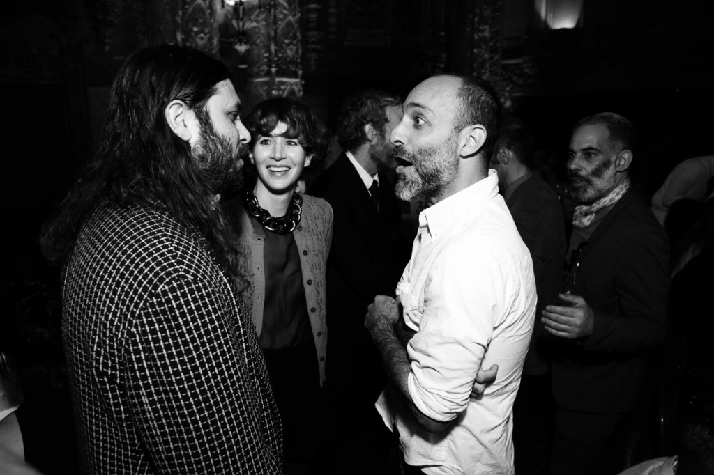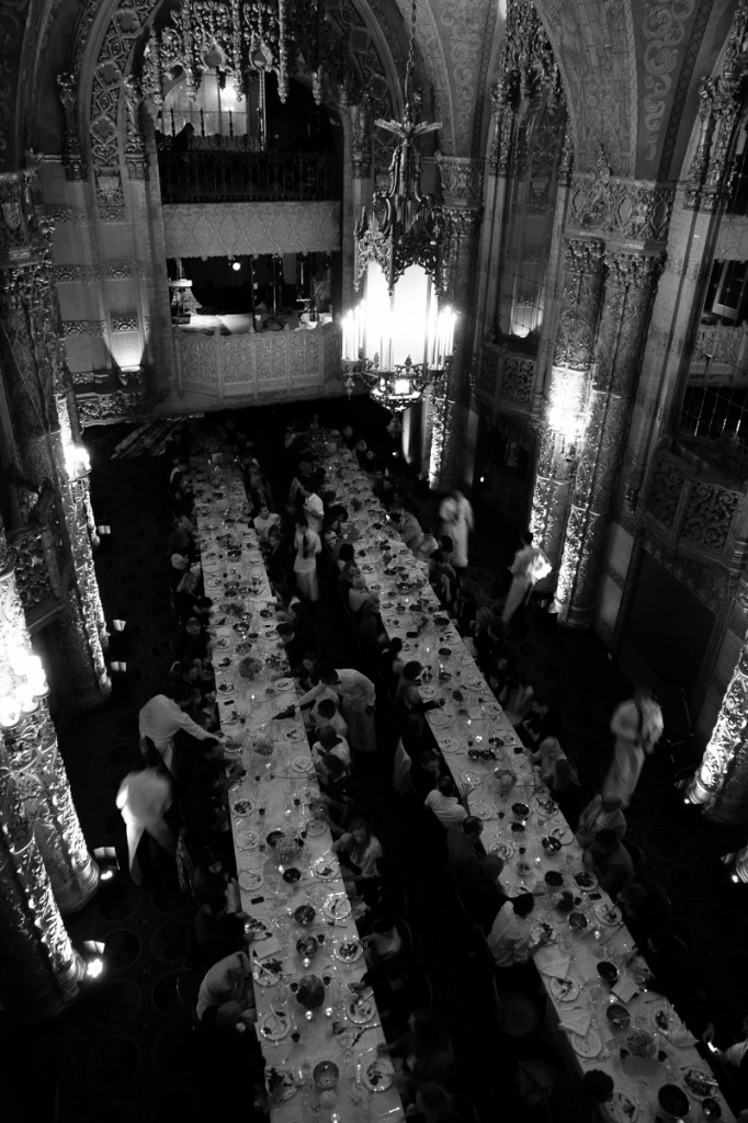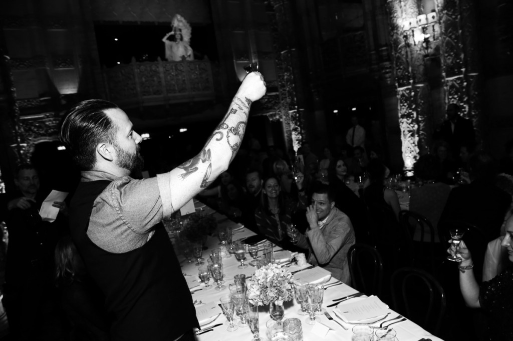 Un plus tard dans la soirée, une centaine d’happy fews a été convié à un dîner de fête dans la grande salle dorée du futur Ace Hôtel qui ouvrira ses portes au mois de janvier dans l’enceinte de l’United Artists Theatre. Sous un chapiteau, le chorégraphe Ryan Heffington accueillait les invités dans le hall avec des pivoines roses lumineuses.