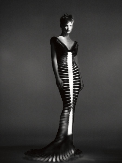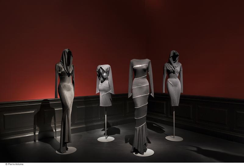 A chaque vêtement, l’image furtive des déesses qui les ont portés se fait de plus en plus précise. On retrouve les robes zippées créées en hommage à Arletti et les fourreaux portés par la plus sculpturale d’entre toutes : Naomi Campbell. Les robes en cuir ou en peaux sont magnifiées, les robes à cagoule façonnent une nouvelle morphologie et les zips semblent tenir dans un souffle la structure même de la robe.