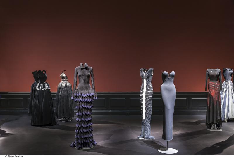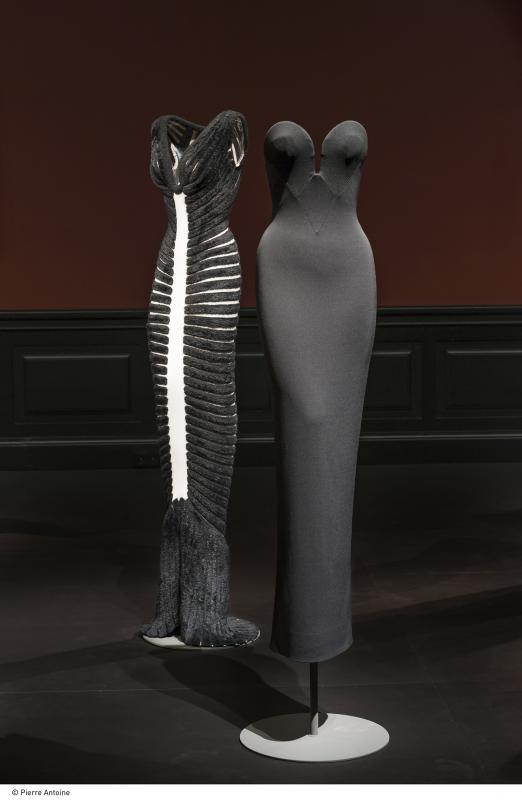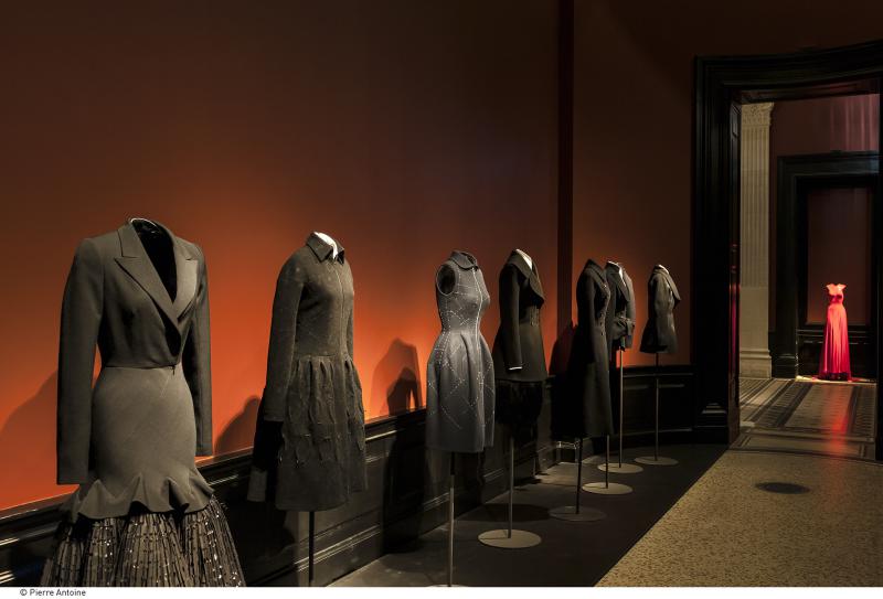Les incontournables du couturier sont ainsi exposés au Palais Galliera sur des formes en plastique transparent à peine éclairées d’une douce lumière qui laisse le palais dans une relative pénombre. Chaque création semble être portée par une femme invisible humblement posée sur une estrade noire, accompagnée des mots d’Olivier Saillard, son ombre se projetant presque involontairement sur les murs rouges sombres.