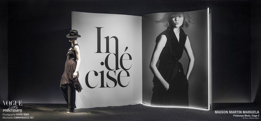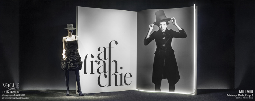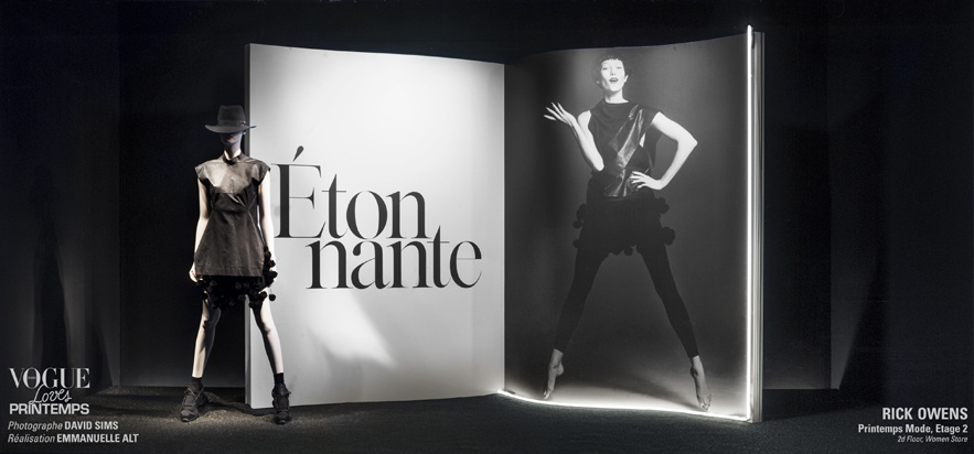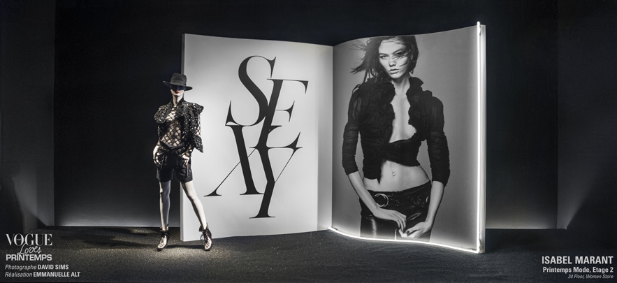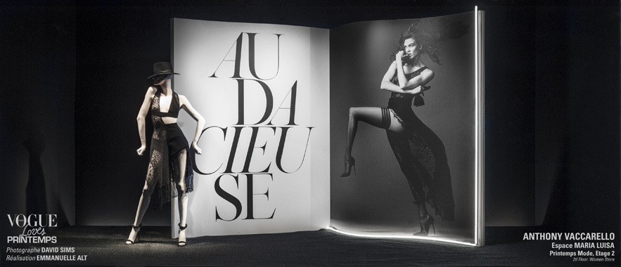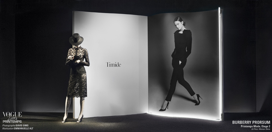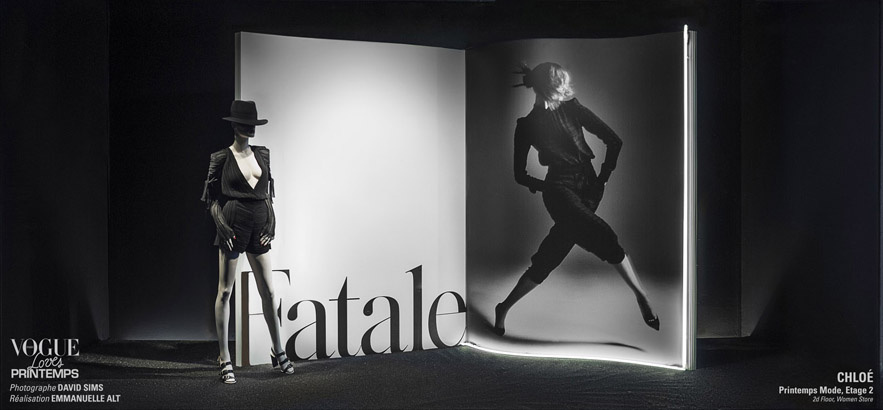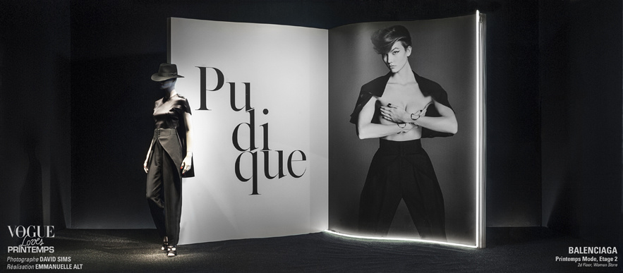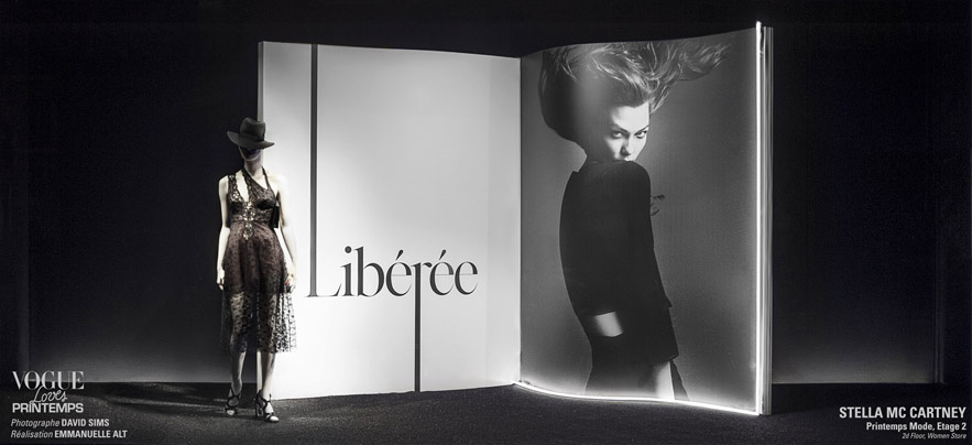 Les mannequins soigneusement habillés pour l’été par les stylistes de la rédaction donnent la réplique à une version géante du magazine, ouvert sur une photographie signée David Sims de la série Affranchie présente dans le numéro du mois de mars. Dans cette mise en scène des meilleurs tenues « black only » vendues au Printemps, le top Karlie Kloss incarne tous les visages de la féminité selon Vogue Paris.