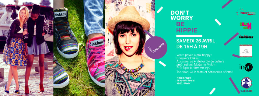 Pour cette nouvelle session sur le thème Don’t Worry, be hippie, l’hôtel Crayon accueillera ce samedi 26 avril de 15h à 19h de nouveaux créateurs. Vous pourrez ainsi découvrir les baskets éthiques Inkkas, les accessoires de Madame Melon qui vous apprendra à réaliser des colliers amérindiens avec un atelier Do it Yourself, la marque de prêt à porter afro hipsters Inyü qui propose une mode haute en couleurs et en imprimés Wax, alliant influences retro et modernité, les boissons Eternity Food et Club Mate.