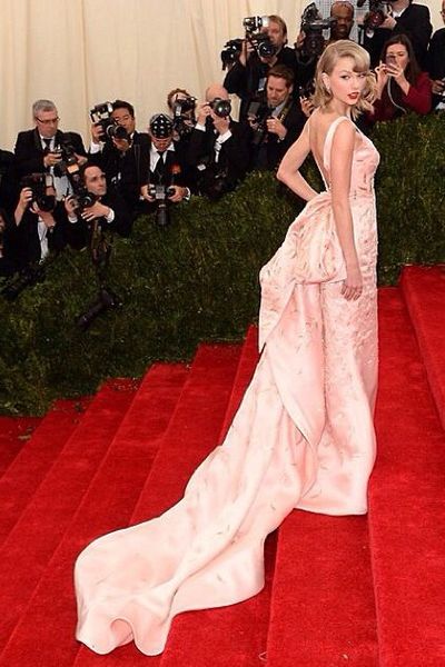 Taylor Swift et sa peau diaphane ont choisi la délicatesse d’un robe rose poudré signée Oscar de la Renta pour monter les marches.