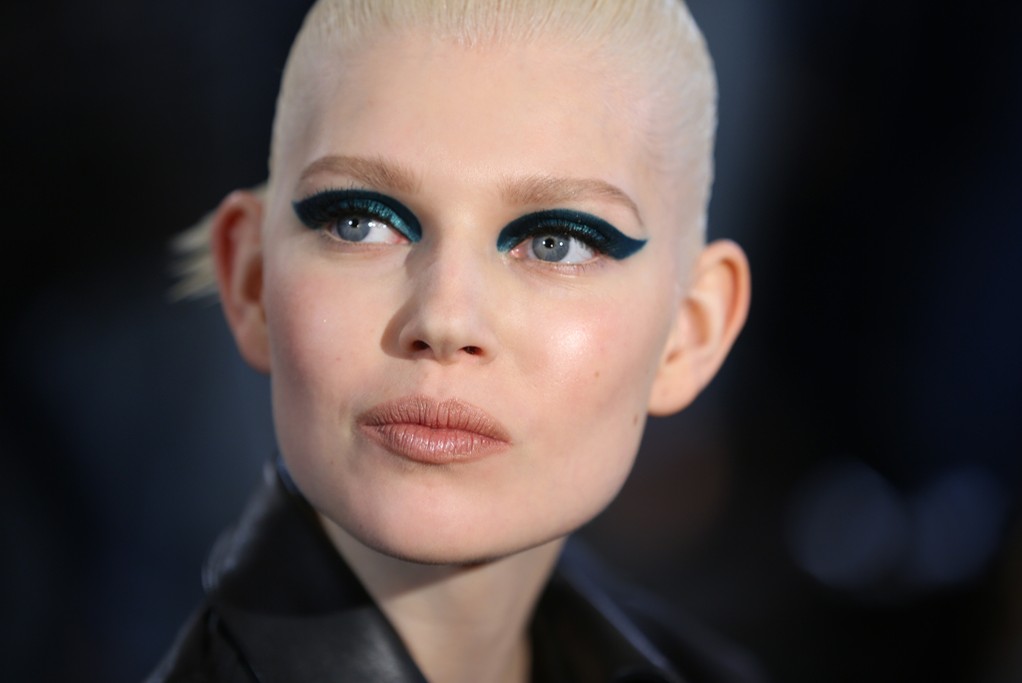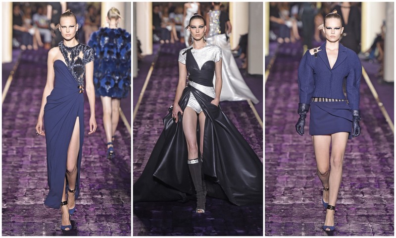Sur d’opulents manteaux en organza de soie s’immisce un patchwork de vison bleu et de chaînes en cristaux, créées exclusivement par la maison Swarovski pour cette collection. La fourrure est très présente – y compris sur le podium en vachette pourpre – associée au vinyle et au cuir.